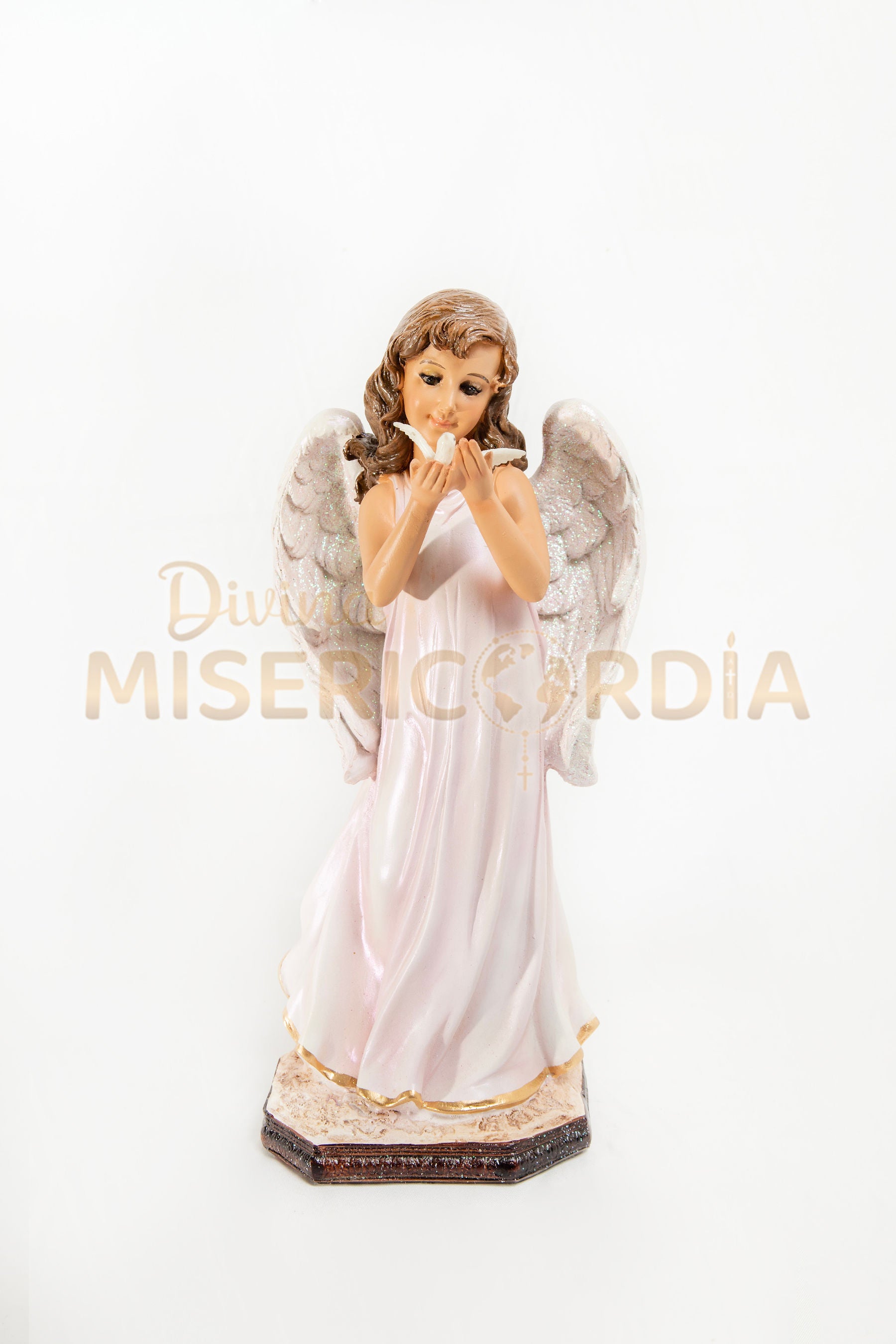 Esta delicada figura representa la pureza y la armonía entre el cielo y la tierra. El ángel sostiene con ternura una paloma blanca, signo del Espíritu Santo y de la paz divina que sana corazones y disipa temores.