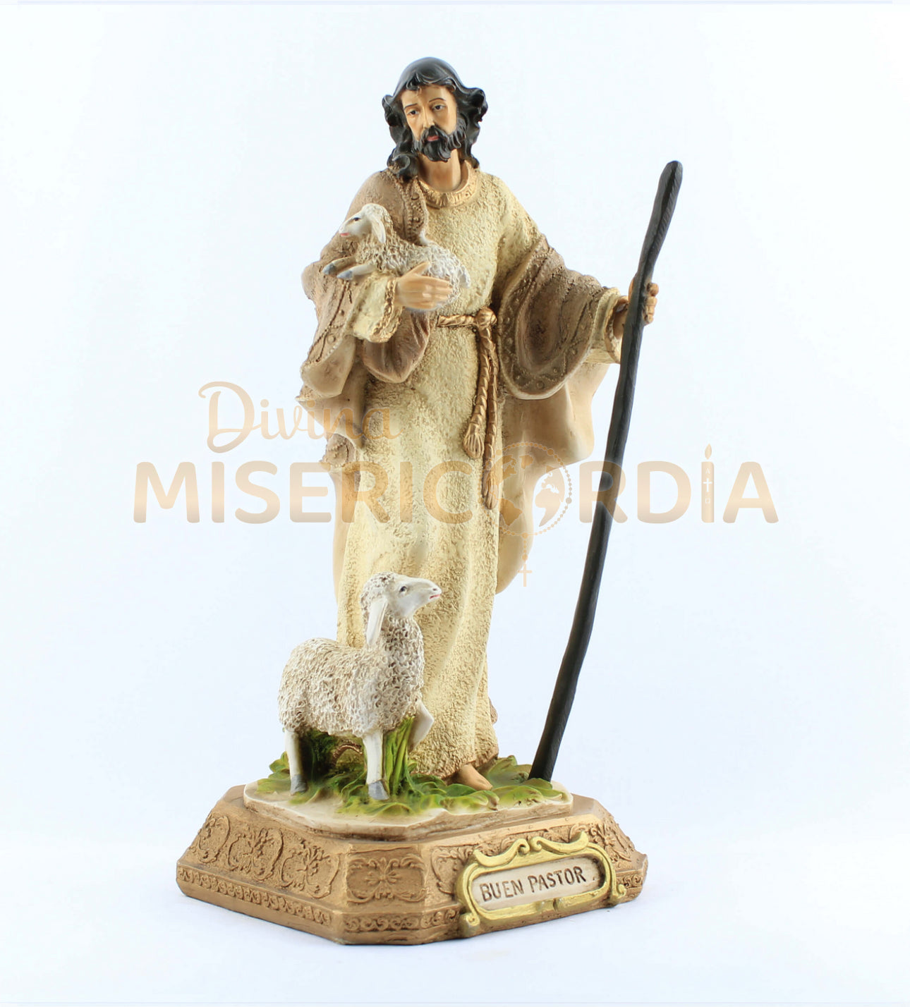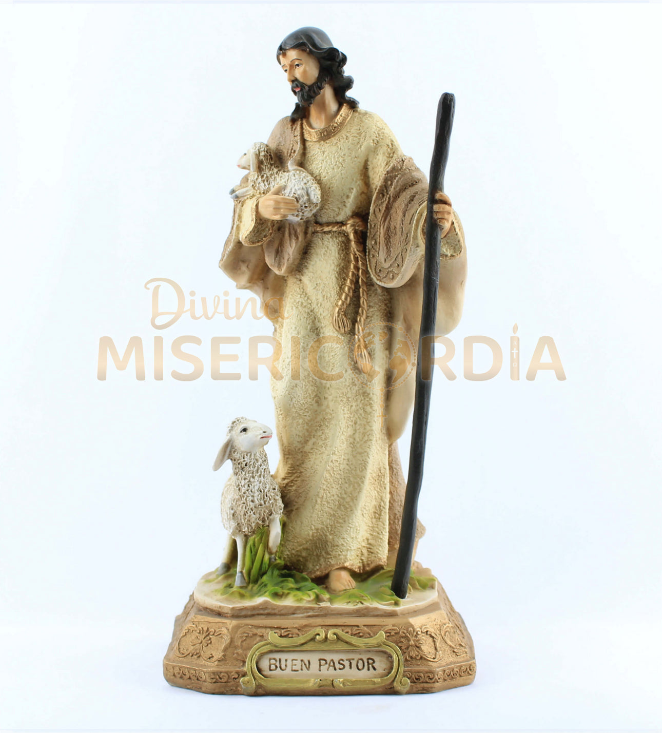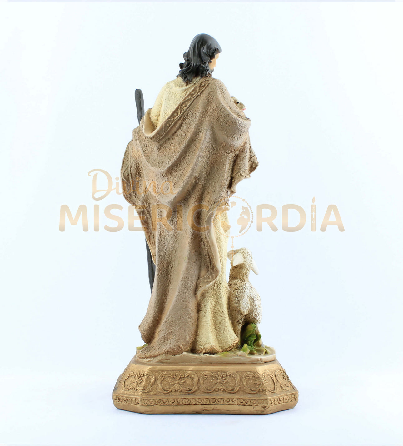 Rinde homenaje al Buen Pastor con esta hermosa escultura, elaborada en resina de alta calidad. Esta figura muestra al Buen Pastor sosteniendo un borreguito en sus brazos, simbolizando su amor incondicional, cuidado y protección hacia sus fieles. El Buen Pastor es un símbolo de la dedicación de Cristo, quien guía y cuida a cada uno de nosotros con ternura y misericordia.