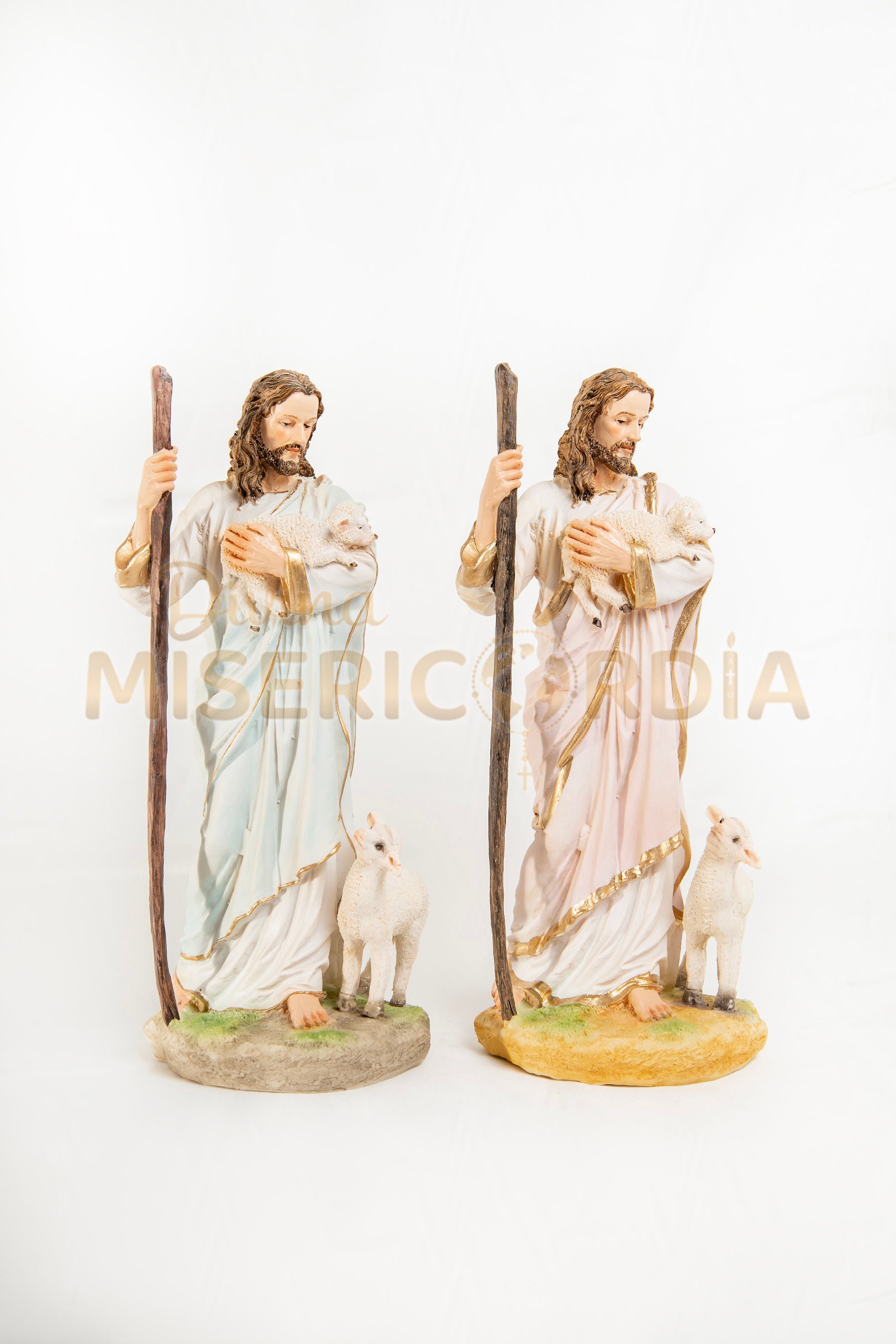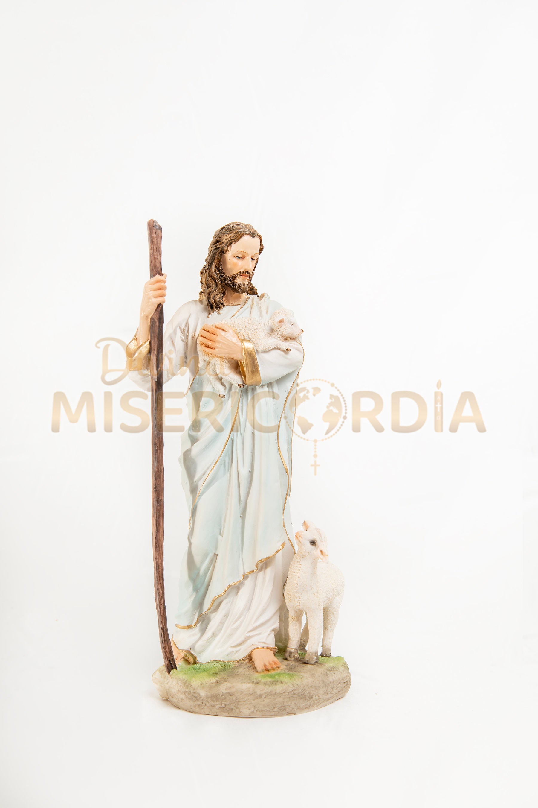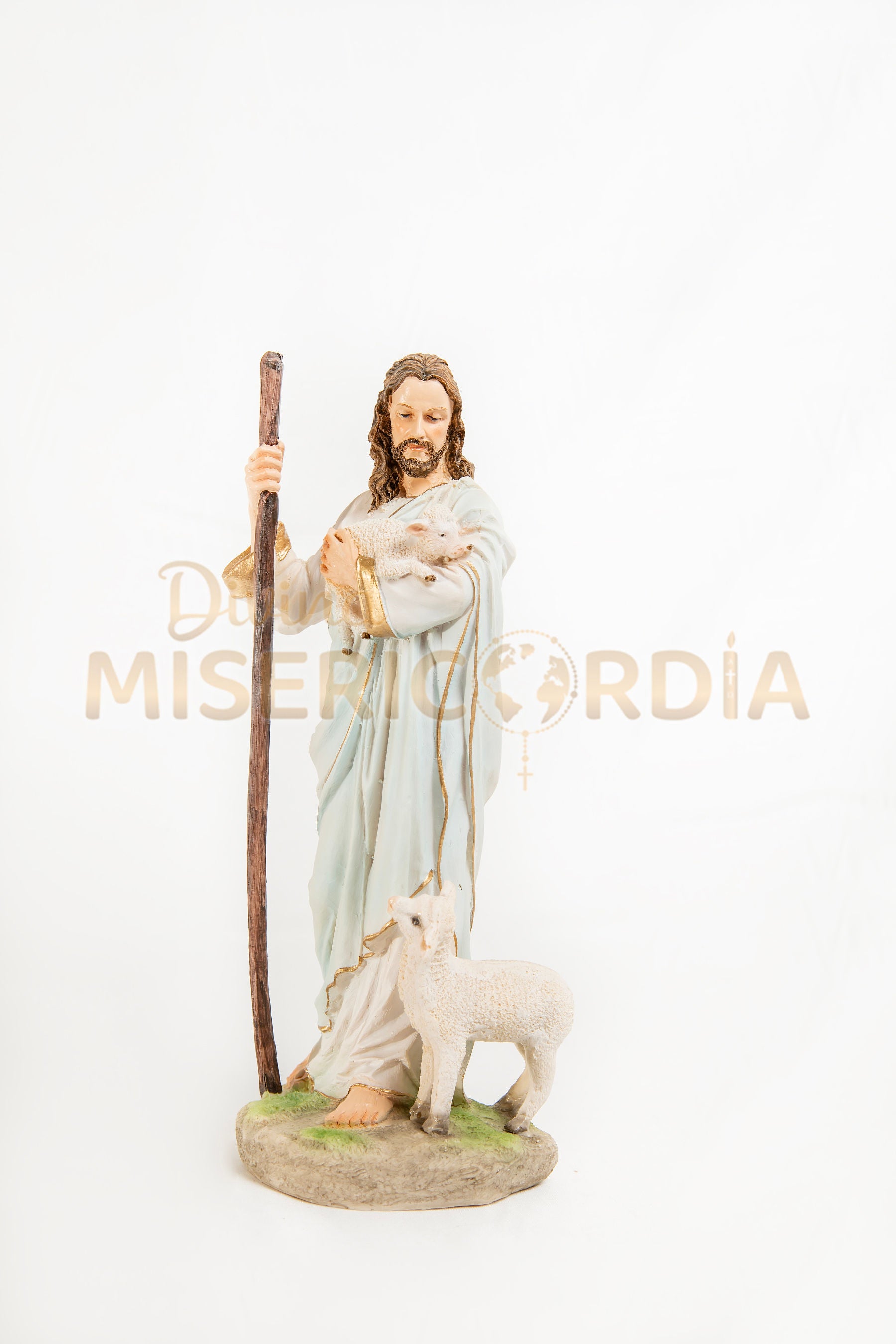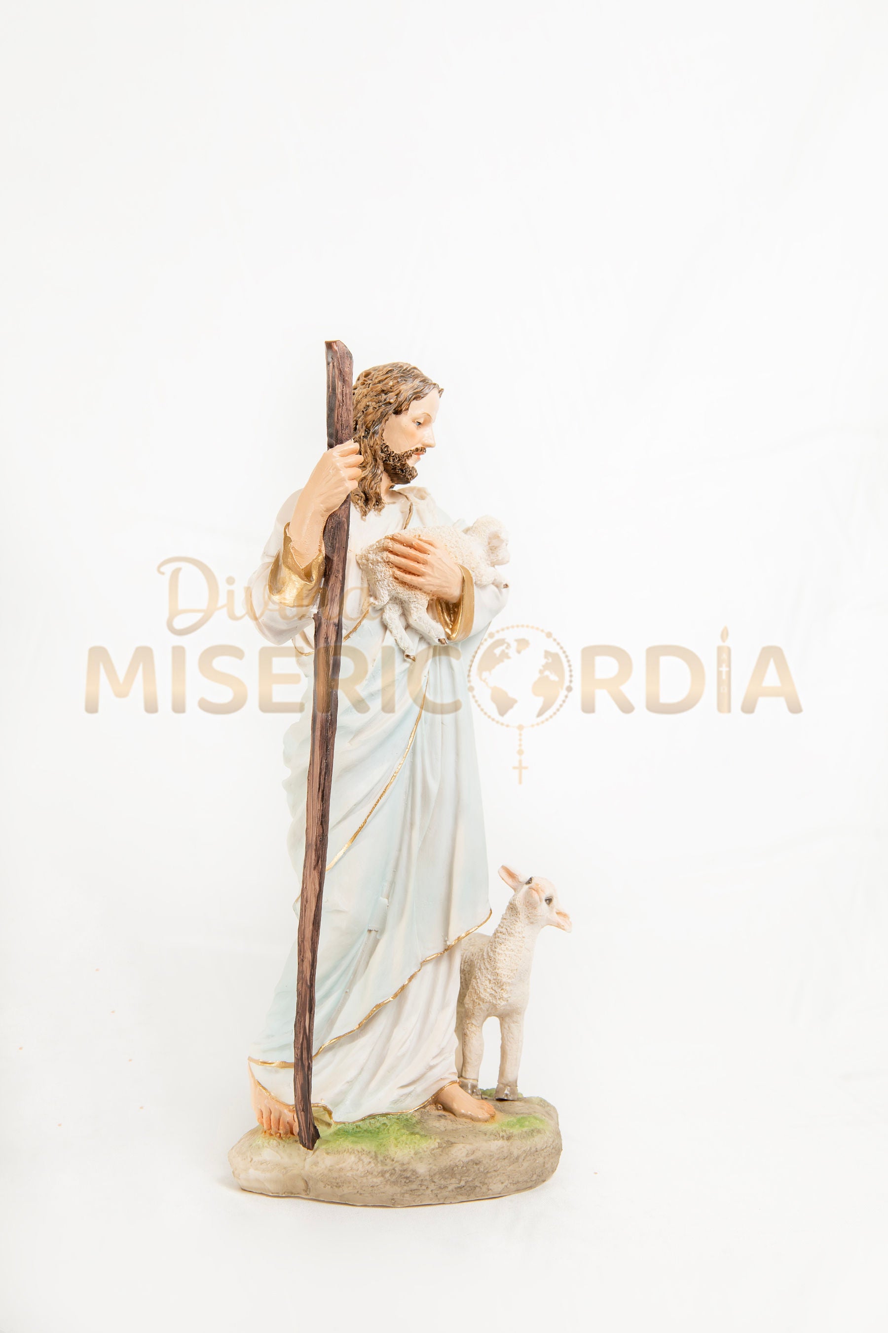 En esta representación, Jesús aparece con su bastón pastoril y una oveja en sus brazos, transmitiendo ternura y protección. Cada detalle ha sido cuidadosamente trabajado para reflejar la compasión y la bondad del Buen Pastor, convirtiendo esta escultura en un elemento ideal para altares, hogares y espacios de oración.