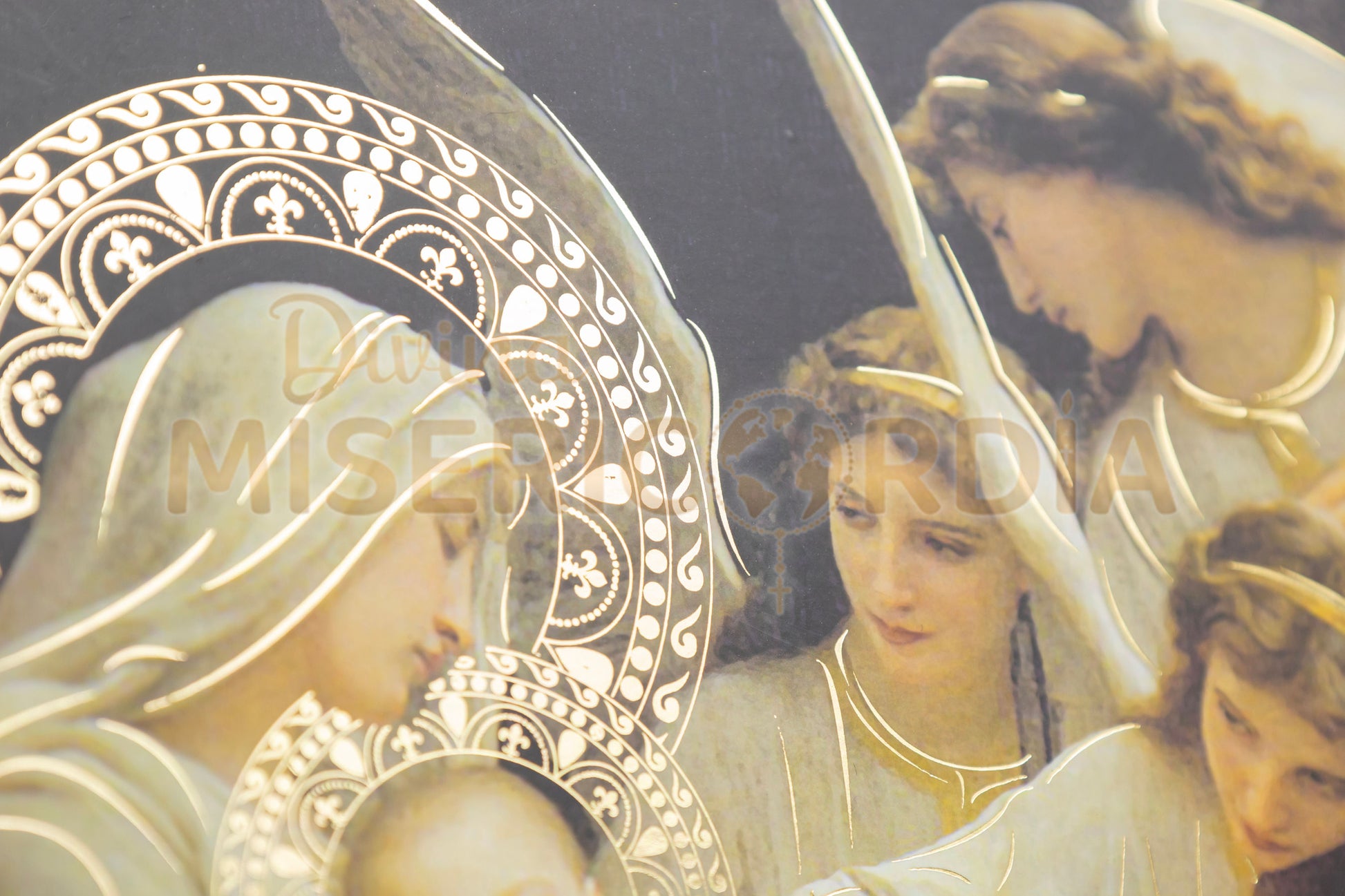 Esta serena imagen representa a los ángeles en armonía celestial, alabando a Dios con instrumentos y cantos de luz. Sus rostros reflejan pureza y alegría divina, invitando a vivir en sintonía con el cielo. Un cuadro que transmite paz, belleza y una atmósfera de adoración constante.