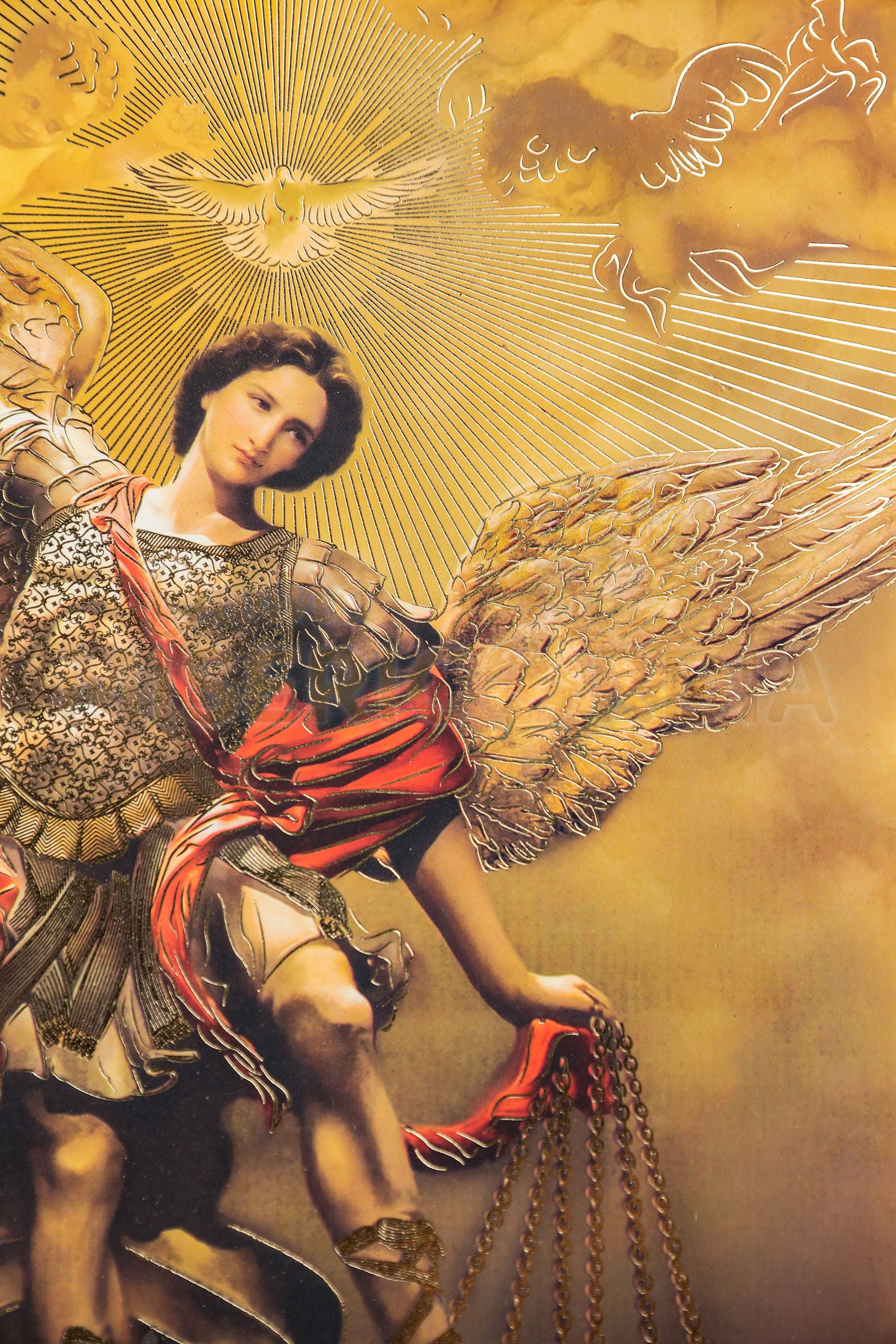 Esta majestuosa imagen de San Miguel Arcángel lo muestra triunfante sobre el mal, con su armadura celestial y espada en alto. Representa la defensa espiritual, la fe inquebrantable y la lucha del bien contra la oscuridad. La hoja de oro resalta su poder con un brillo celestial ⚔️✨