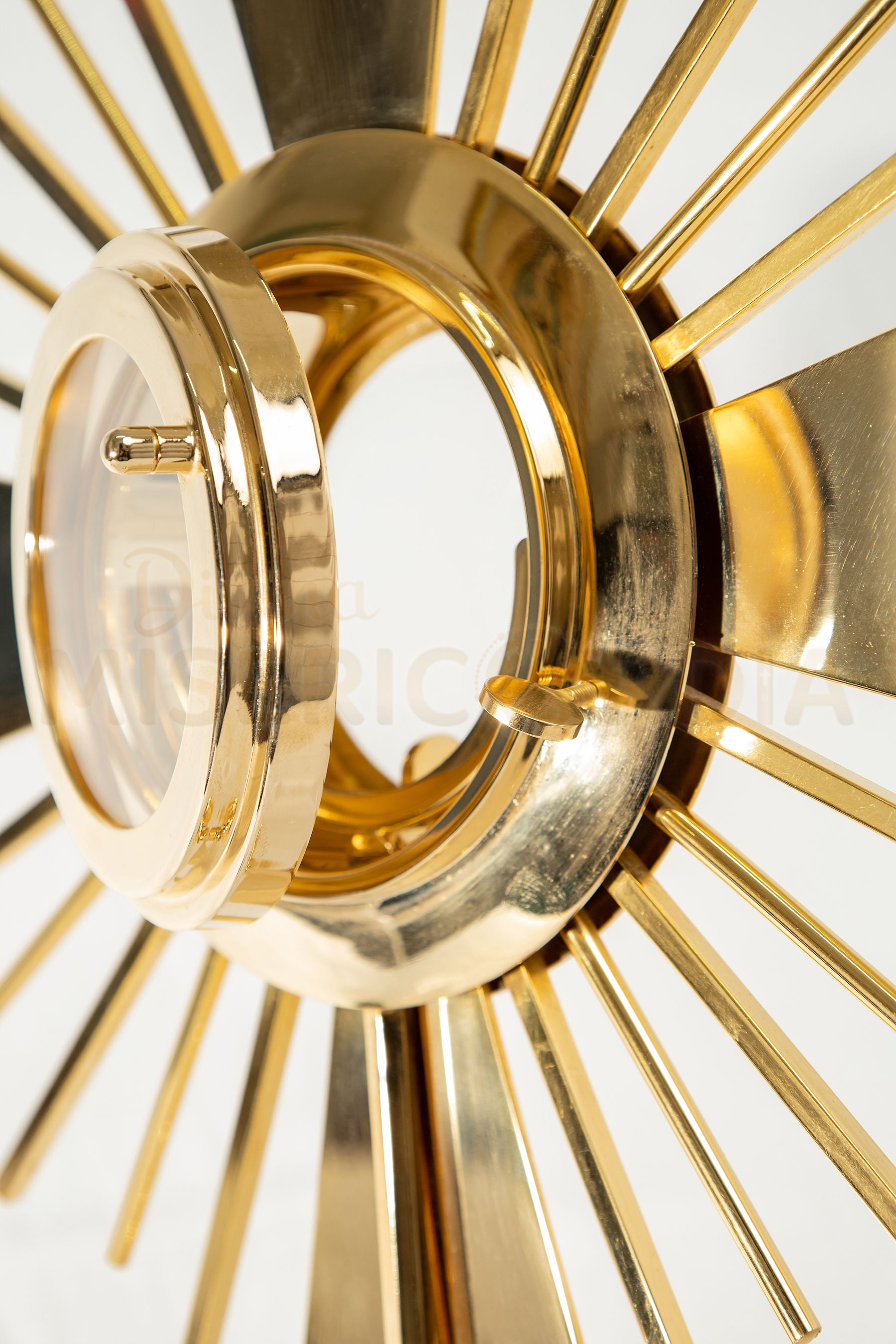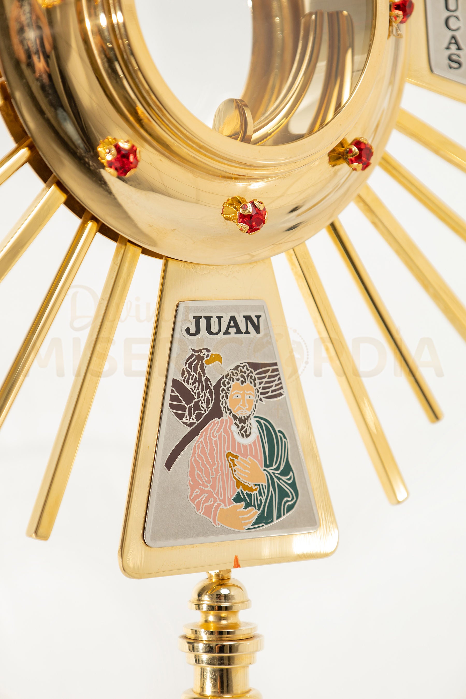 Presenta la Eucaristía con solemnidad y distinción con esta custodia chapeada en oro de 24K, elaborada con materiales de alta calidad que aseguran brillo, durabilidad y un acabado excepcional. Su diseño refinado y detallado convierte esta pieza en un elemento central del altar, realzando cualquier celebración litúrgica.
