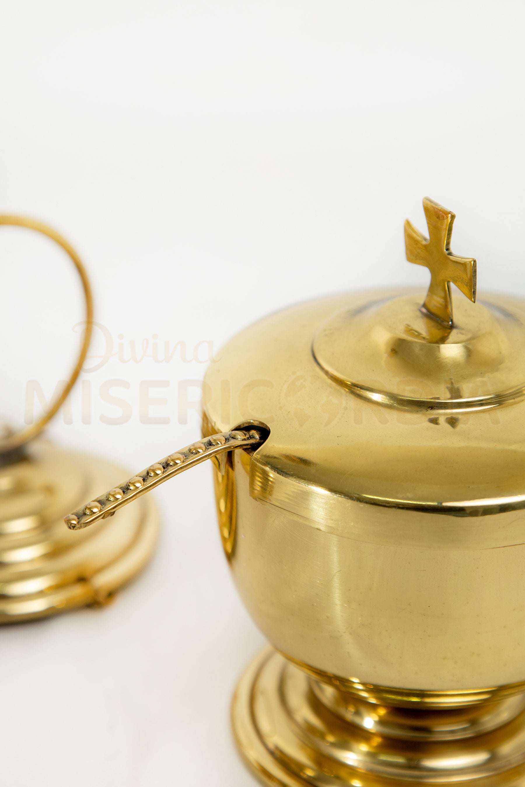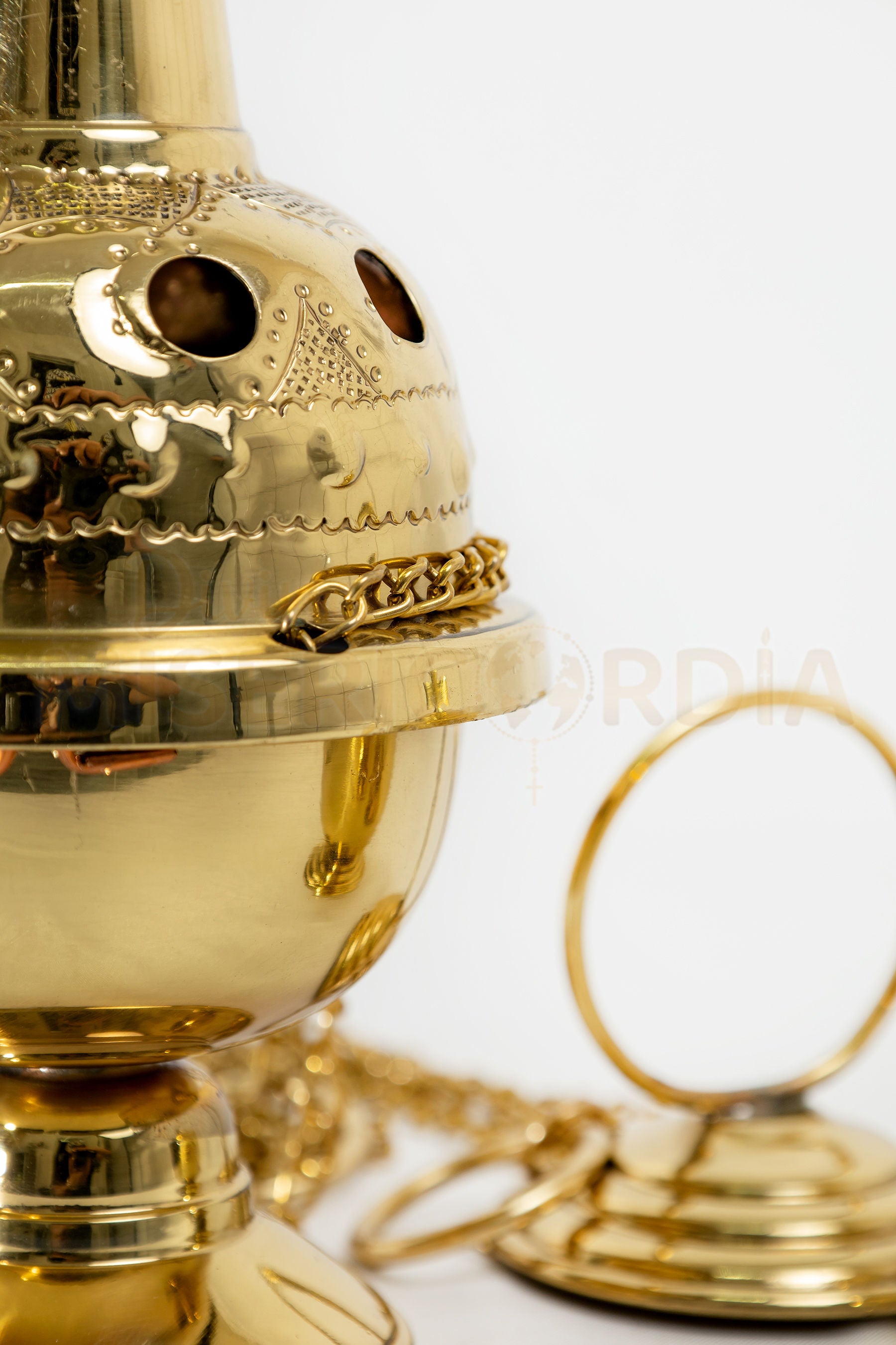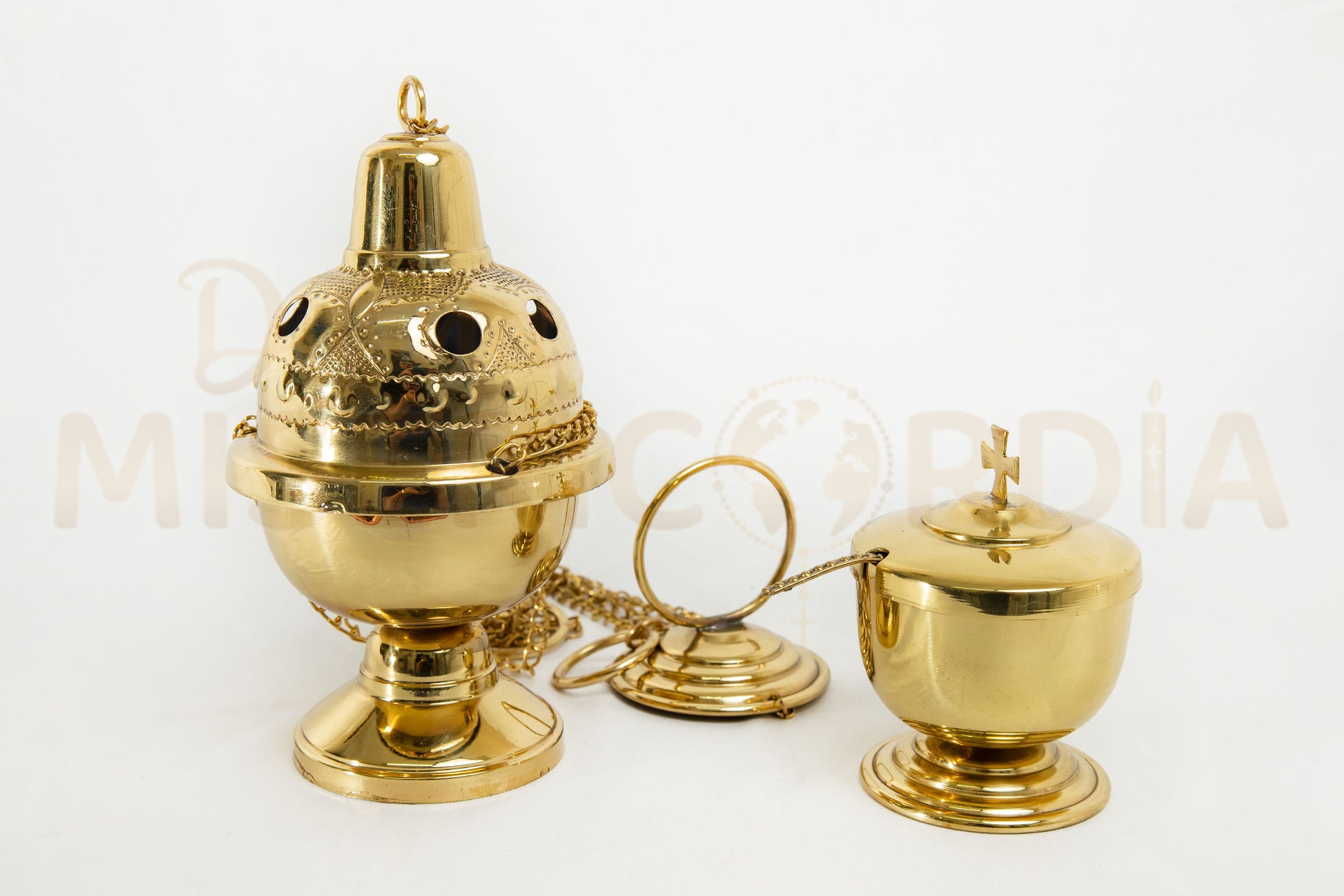 Realza la solemnidad de la liturgia con este incensario elaborado en latón de alta calidad, diseñado para la quema de incienso durante la misa, procesiones y celebraciones especiales. Su acabado fino y resistente asegura durabilidad, mientras que su diseño artesanal aporta belleza y reverencia al rito sagrado.