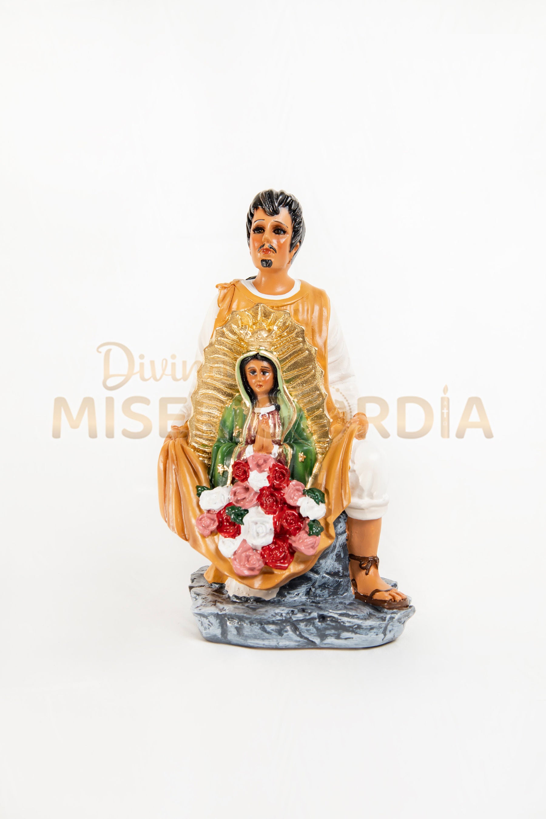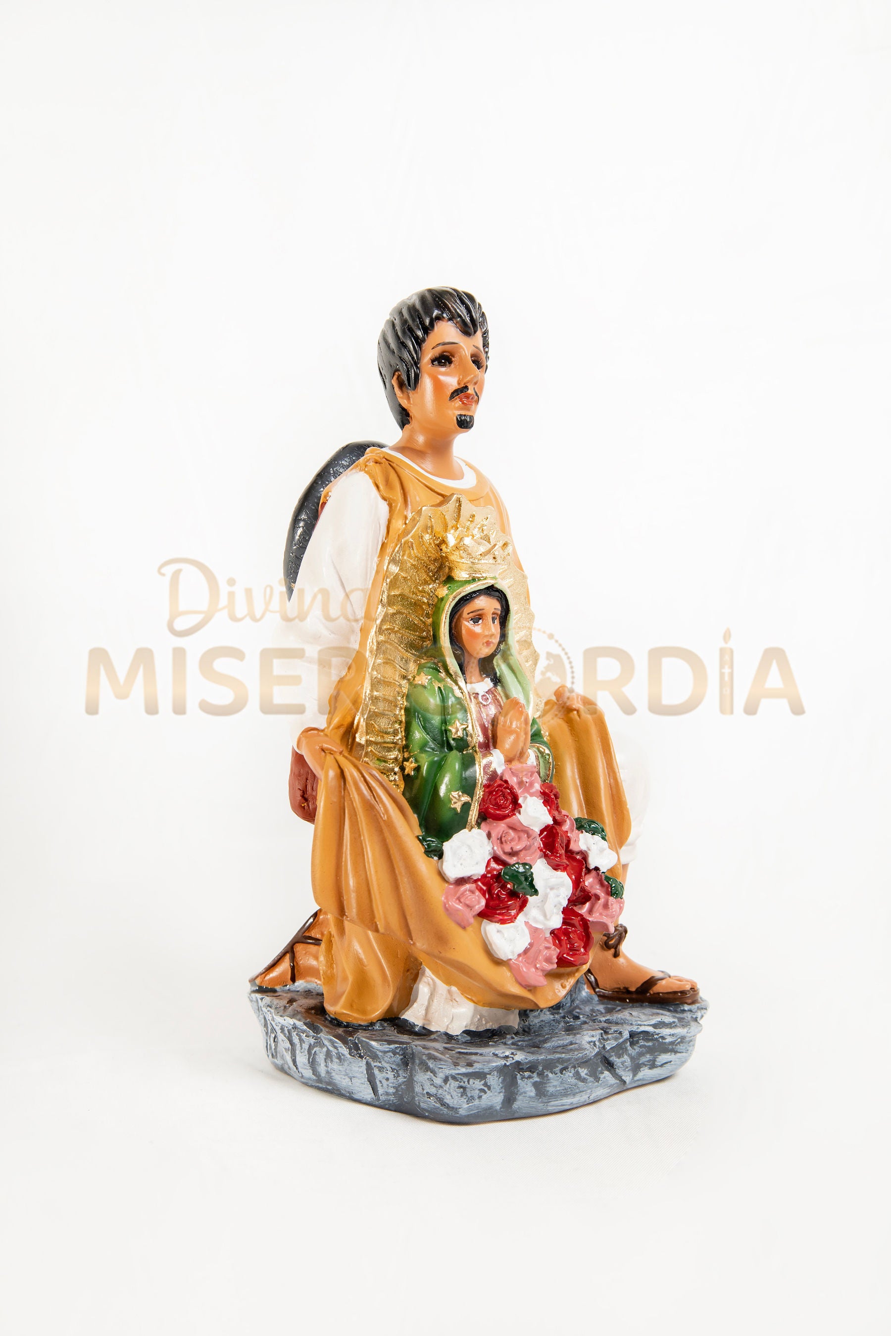 Esta pieza refleja su importancia en la historia de la Iglesia en México y es ideal para altares, hogares y espacios de oración donde se busca recordar el milagro de la Virgen de Guadalupe y la fuerza de la fe humilde y verdadera.