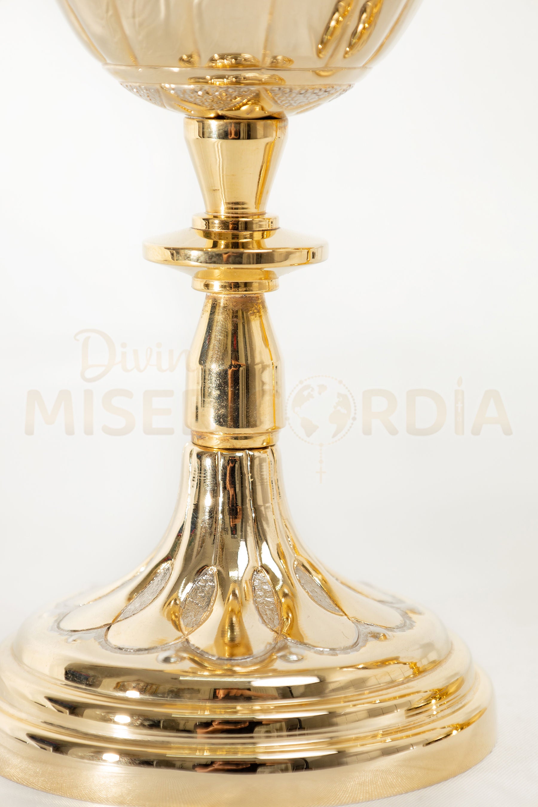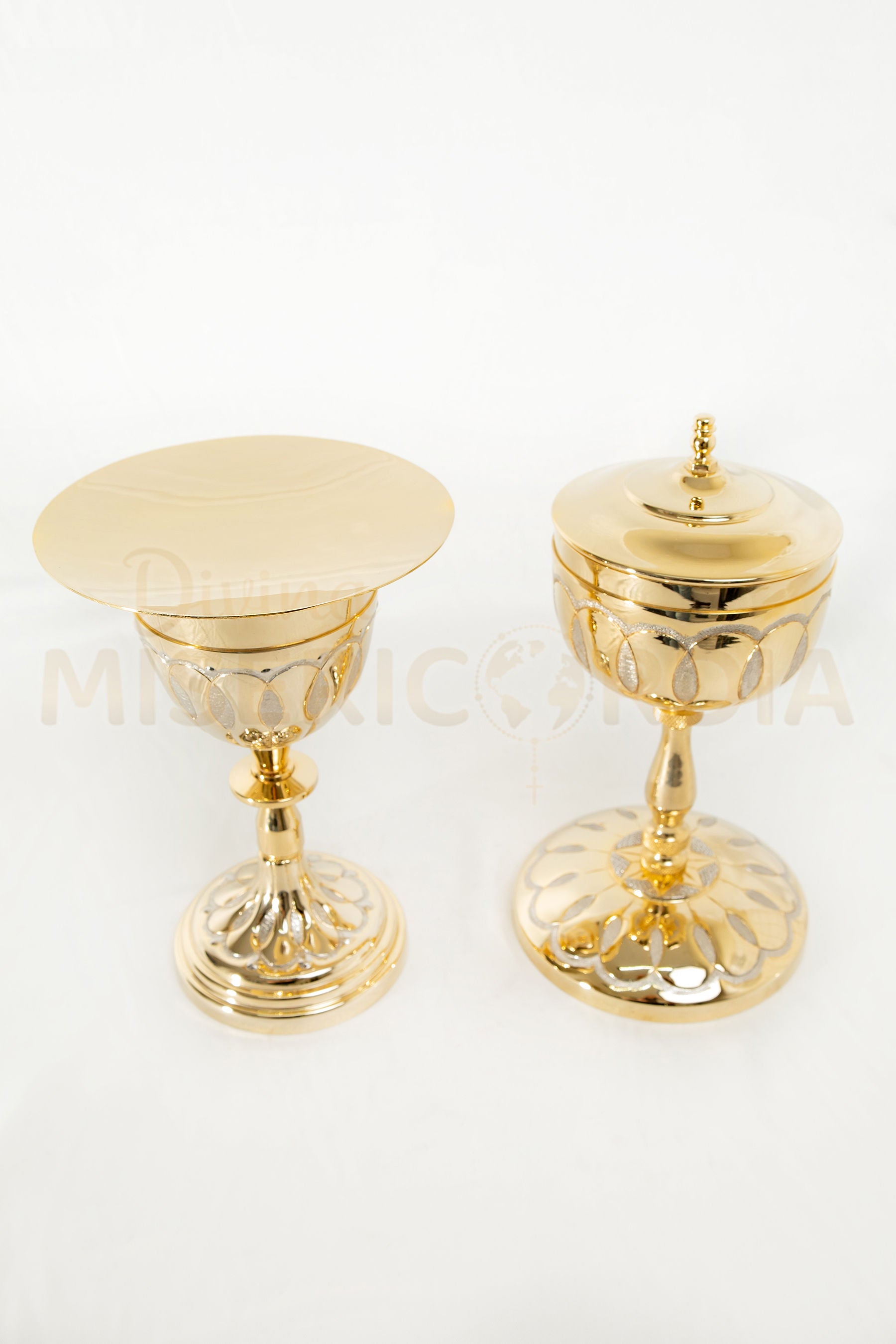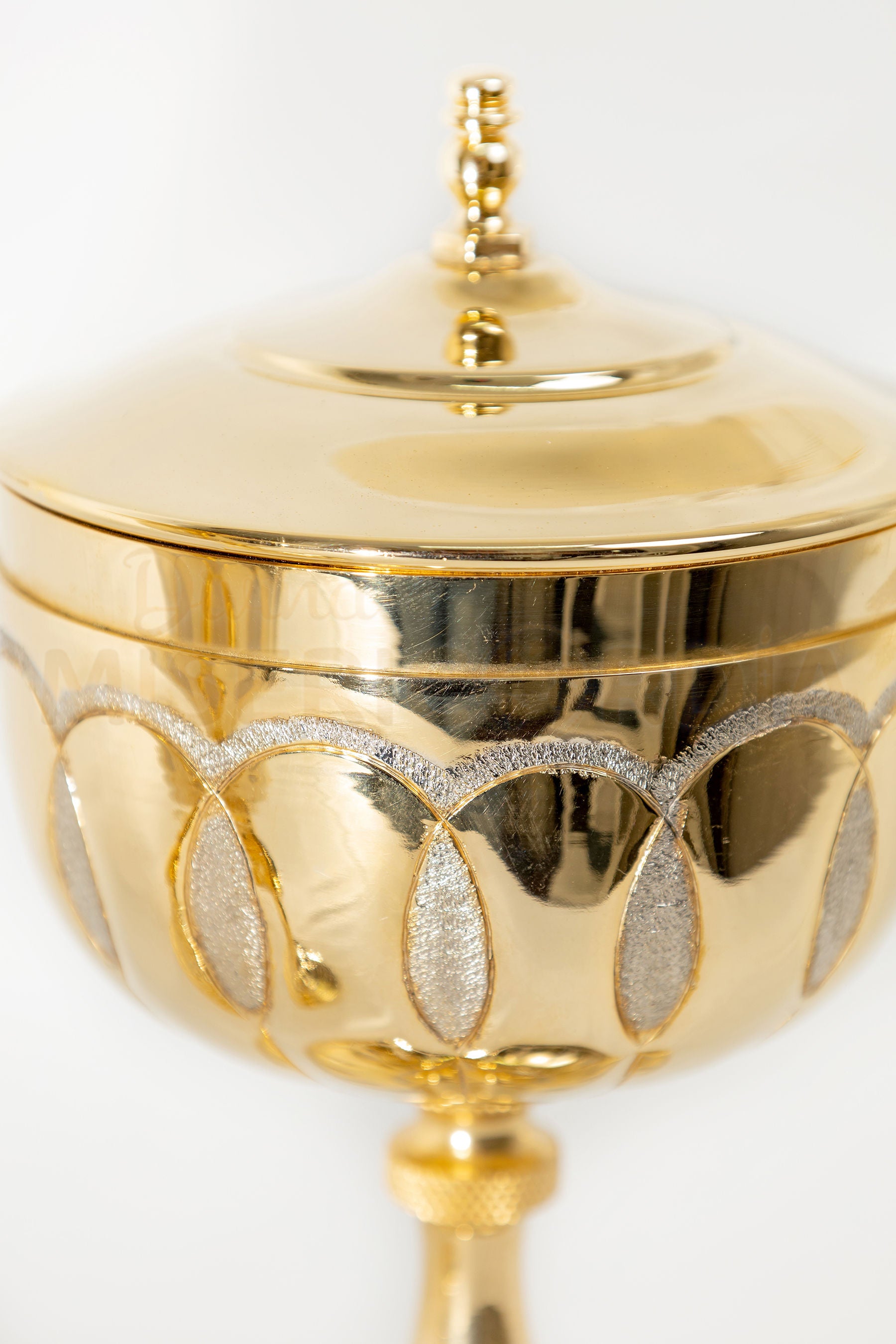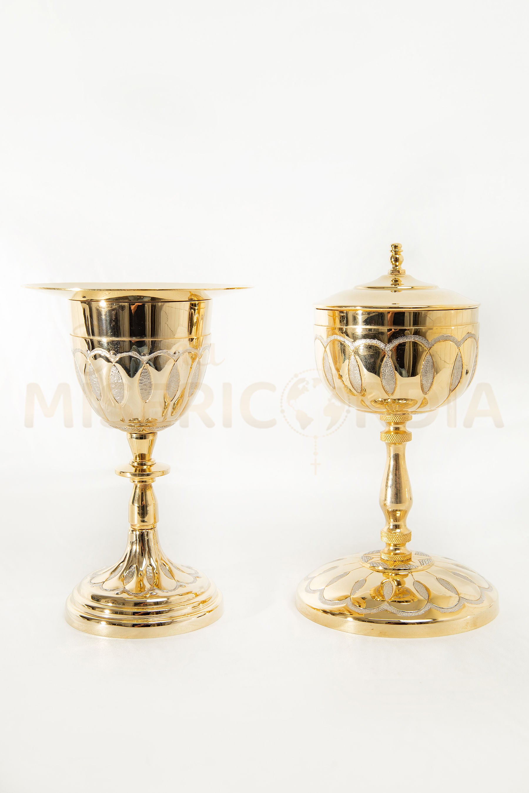 Celebra la Eucaristía con solemnidad gracias a este kit litúrgico compuesto por cáliz y copón, acompañados de su patena y elaborados en níquel de alta calidad con detalles en baño de oro, que realzan su diseño con un contraste elegante y devocional.
