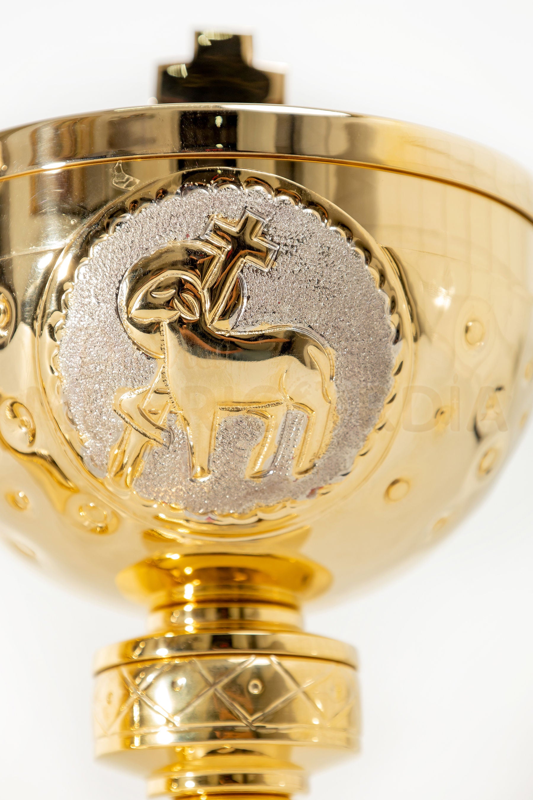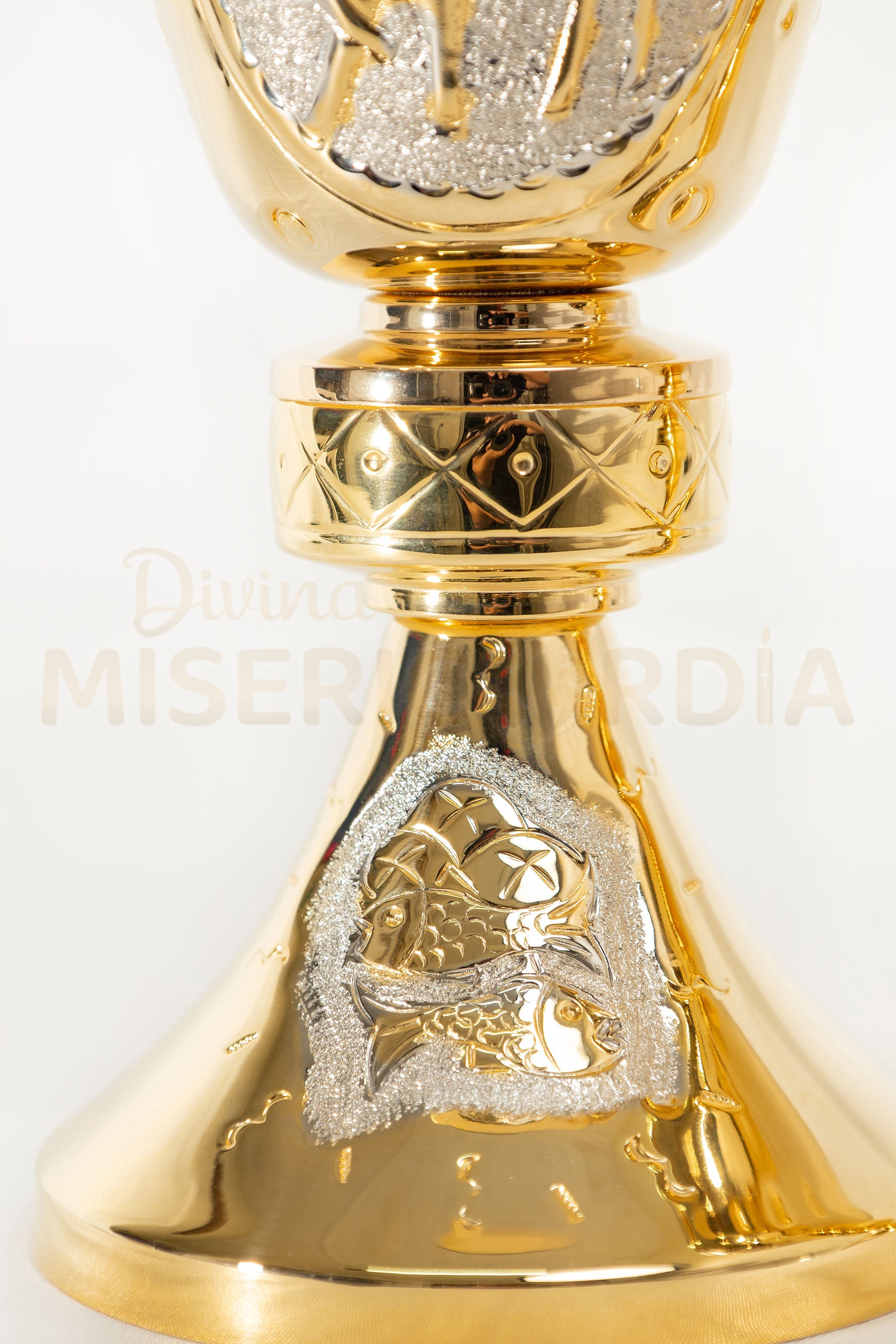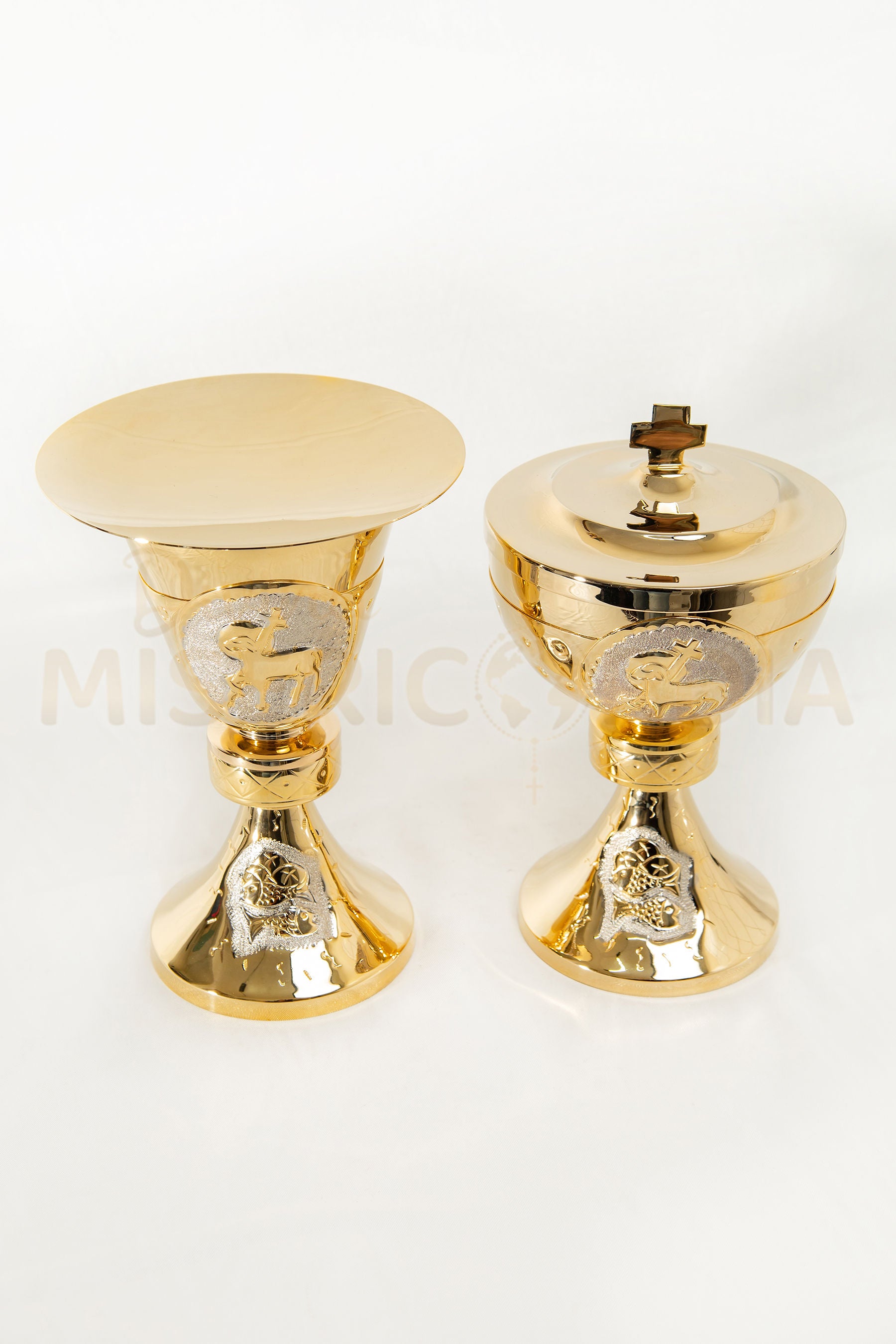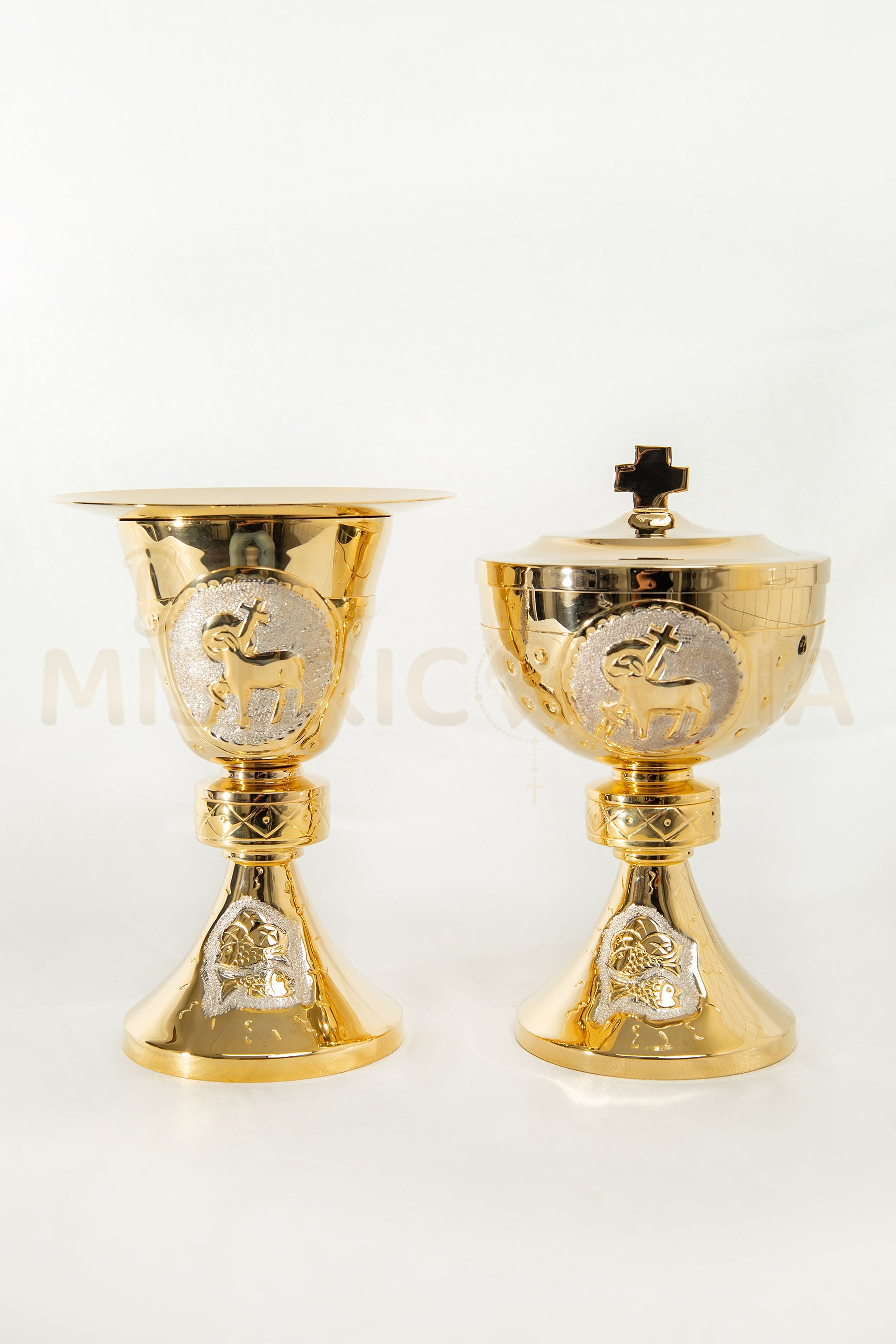 Celebra la Eucaristía con este kit litúrgico compuesto por cáliz y copón, acompañados de su patena y elaborados con materiales de alta calidad. Terminados en baño de oro, ofrecen un acabado brillante, duradero y lleno de solemnidad, ideal para realzar el altar y dar honor a cada celebración.