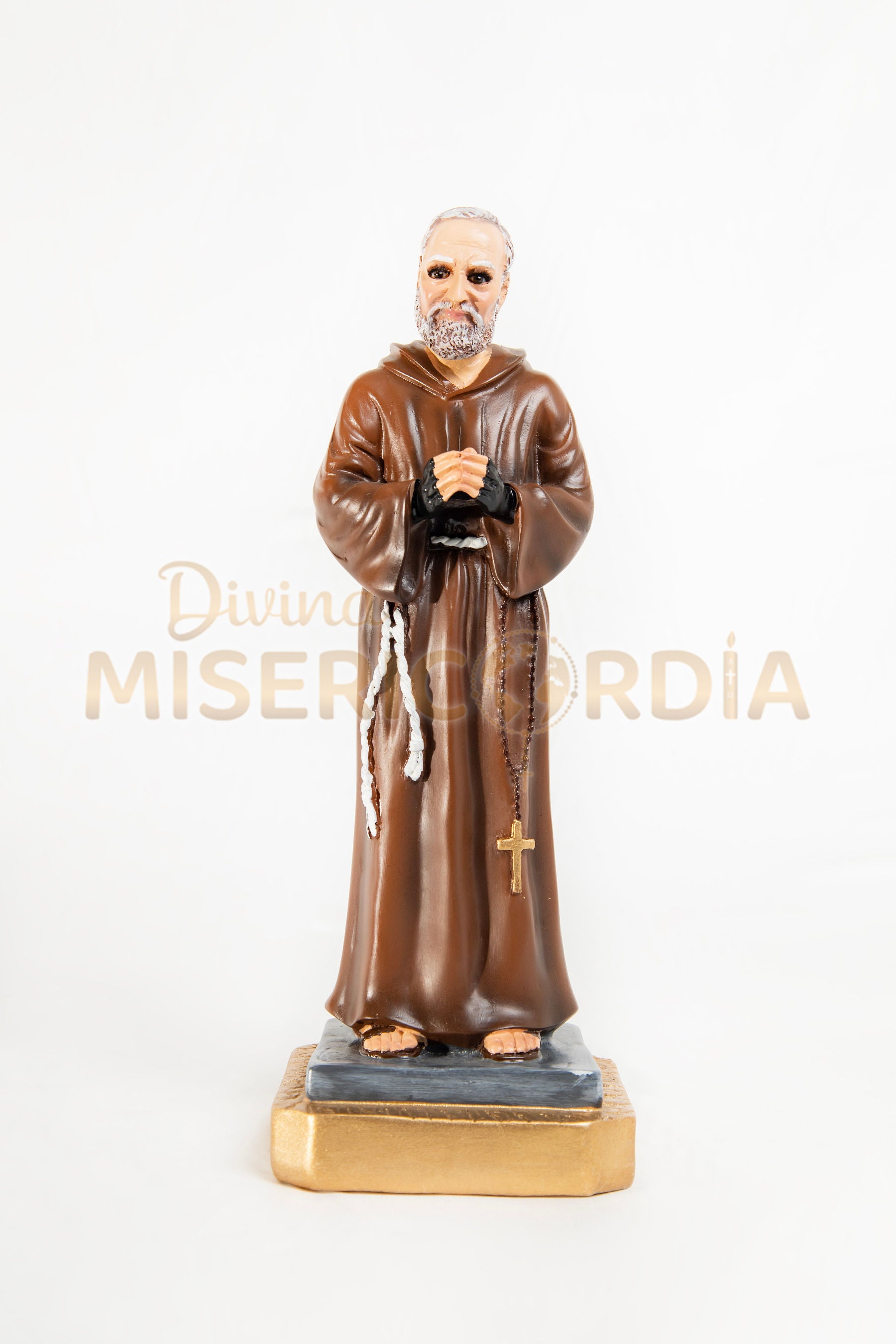 Rinde homenaje a Padre Pío de Pietrelcina, santo conocido por sus dones espirituales, incluyendo los estigmas, la confesión y la oración profunda. Esta hermosa escultura, elaborada en resina de alta calidad, refleja su humildad, santidad y dedicación a la reconciliación con Dios.