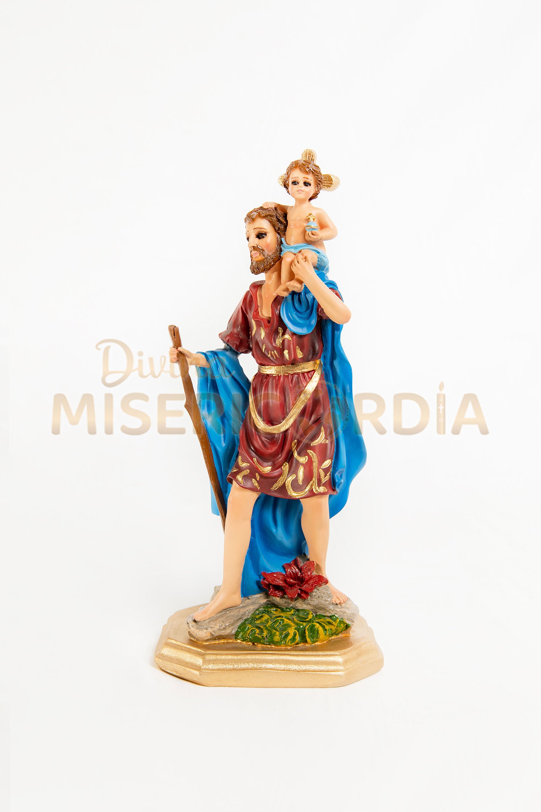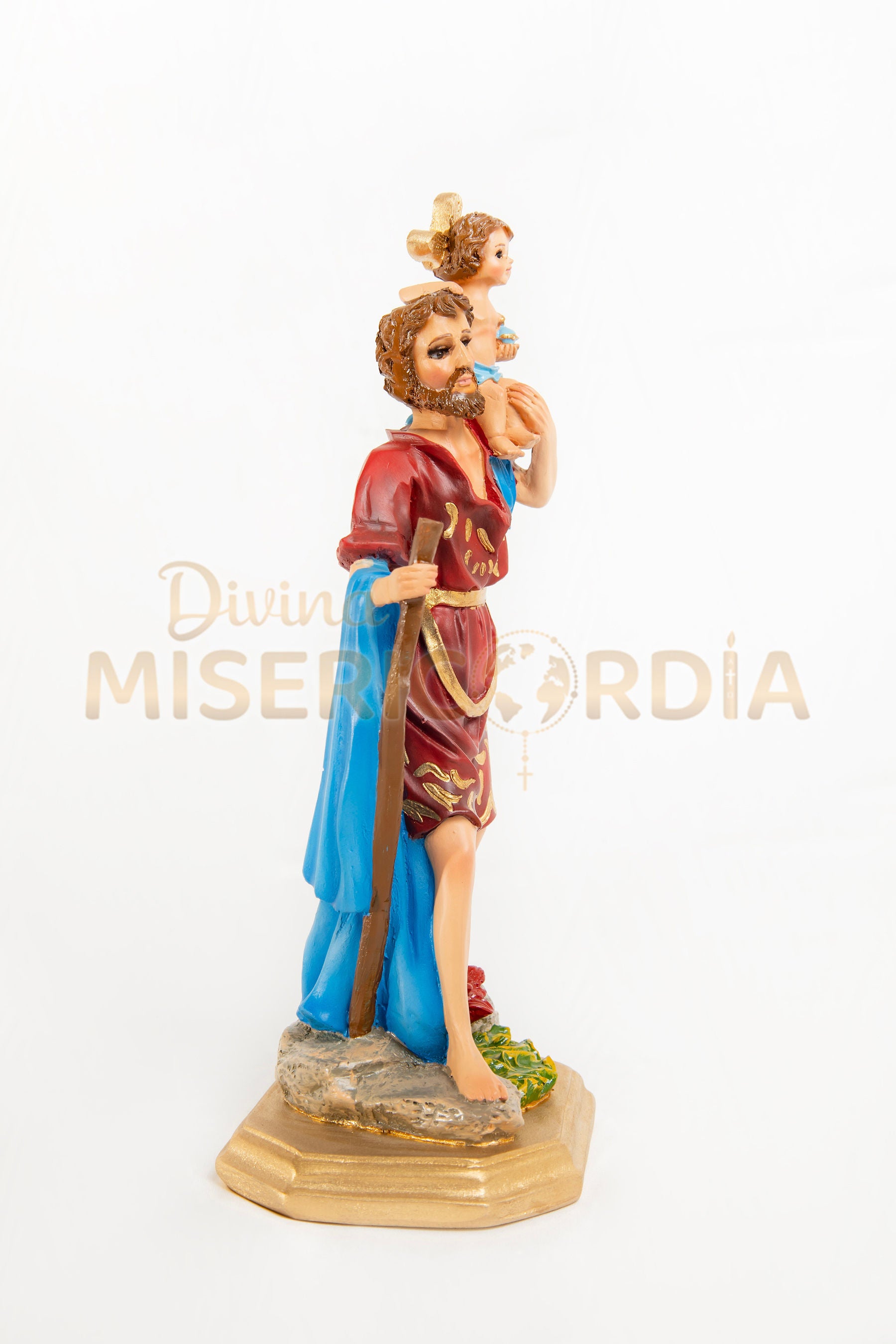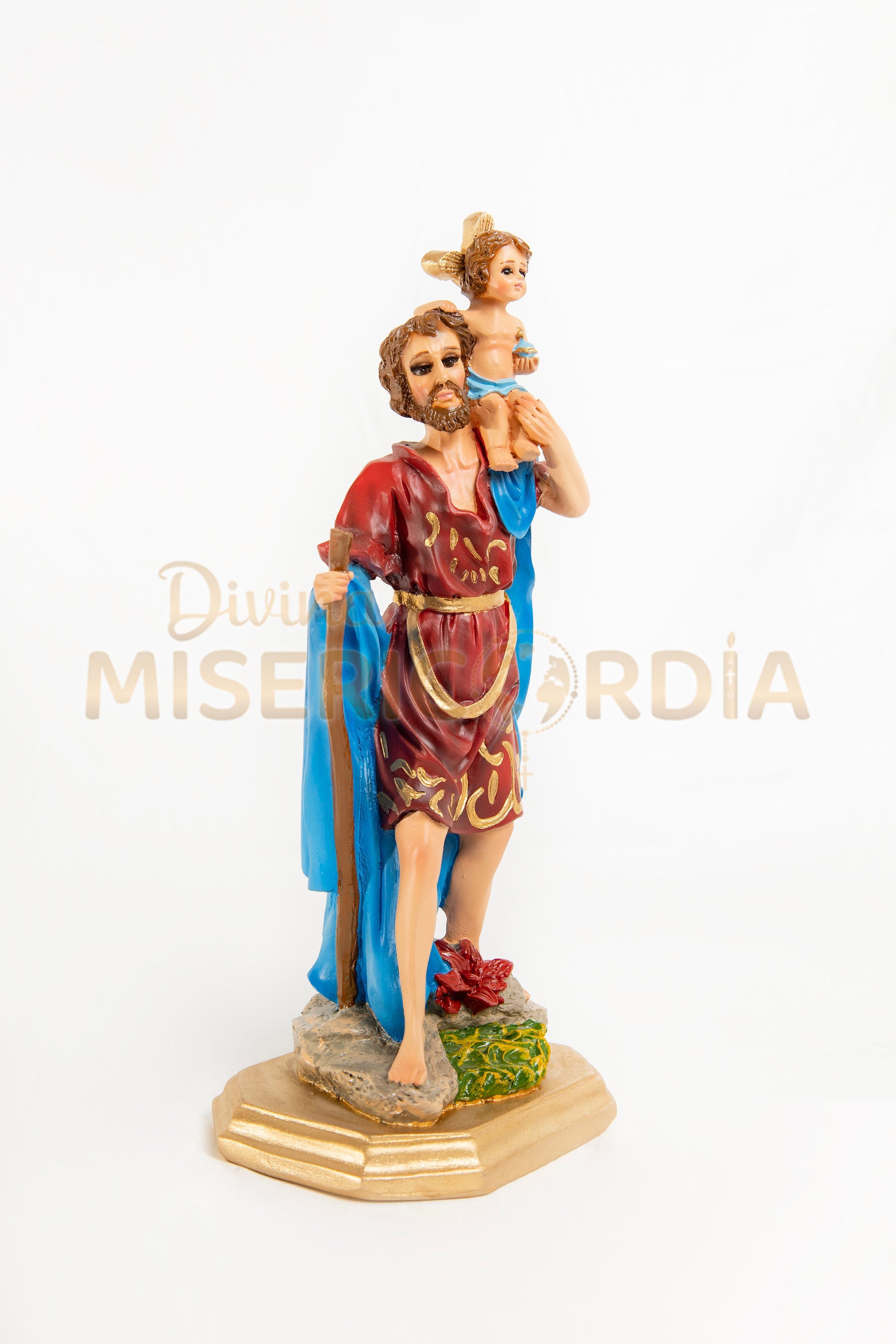 Rinde homenaje a San Cristóbal, patrono de los viajeros y protector en los caminos, con esta hermosa escultura elaborada en resina de alta calidad. San Cristóbal es conocido por su fuerza y generosidad al ayudar a cruzar a personas a salvo, simbolizando la protección y el acompañamiento en cada viaje de la vida.