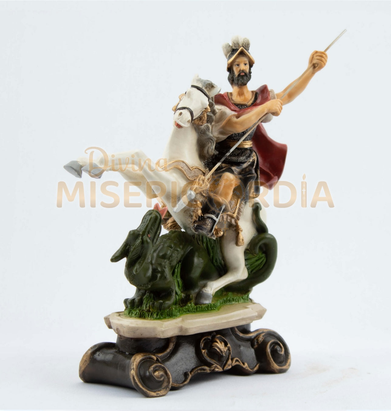 Rinde homenaje a San Jorge, el valiente caballero y patrón de los guerreros, con esta impresionante escultura elaborada en resina de alta calidad. Representado montando su caballo y luchando contra un dragón, San Jorge simboliza la victoria del bien sobre el mal, la valentía, la fe y la protección divina. Su lucha contra el dragón representa el triunfo de la justicia, la pureza y el poder de la fe cristiana frente a las adversidades.