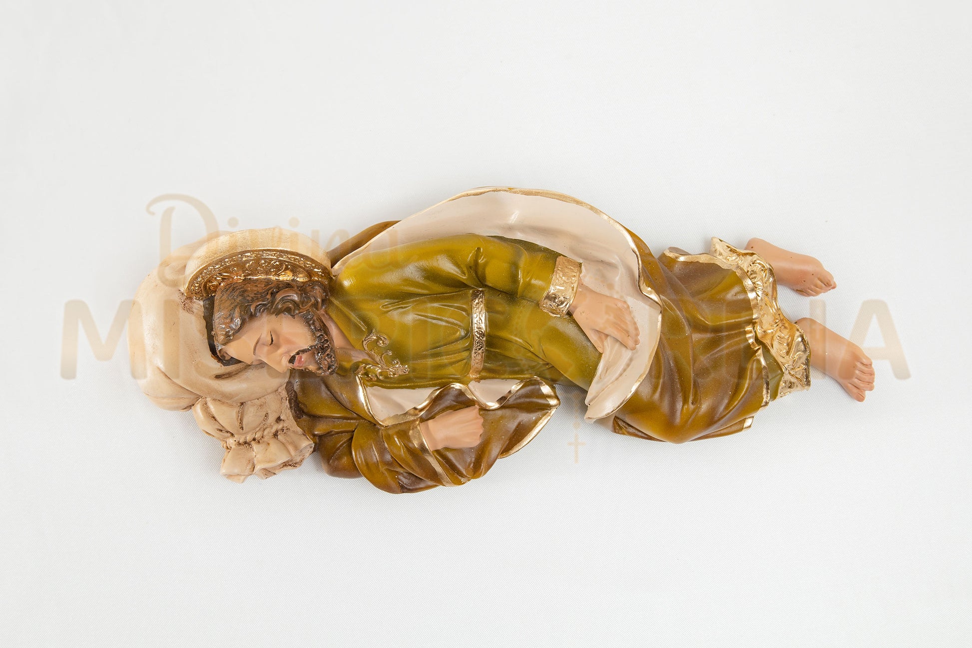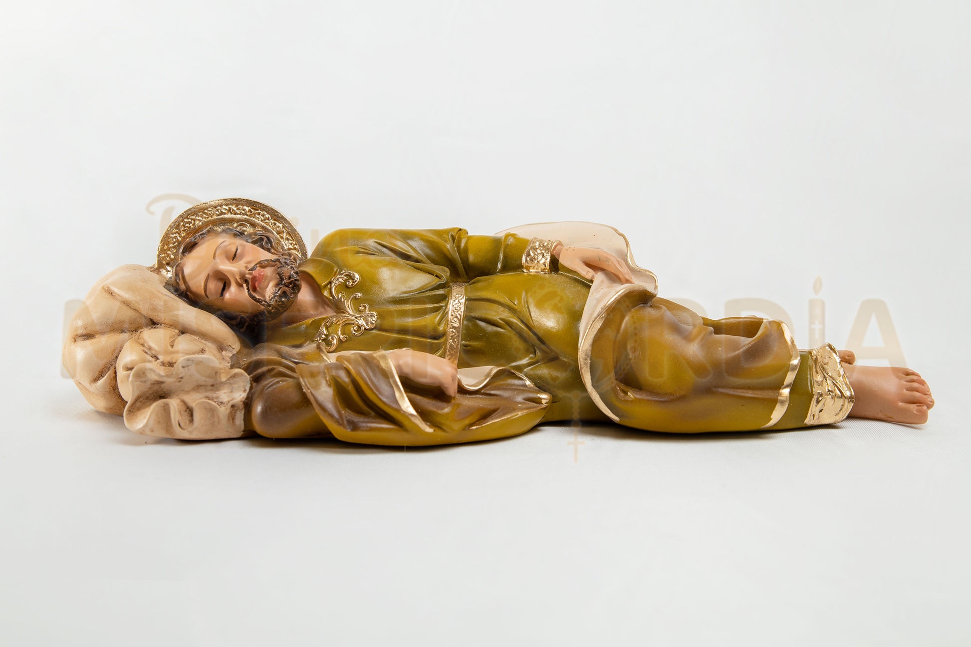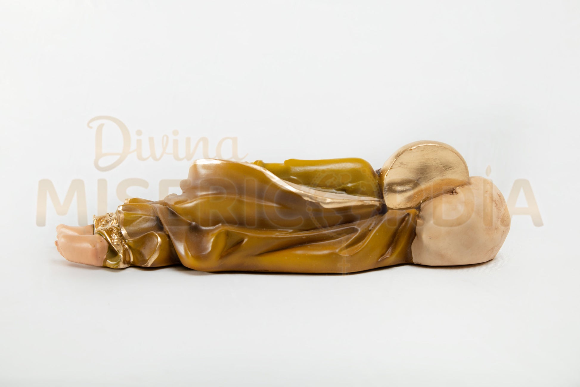 🛏️ Representación de San José en reposo, basada en la devoción promovida por el Papa Francisco, quien confía sus intenciones y preocupaciones al santo mientras duerme. Esta figura simboliza la fe silenciosa, la obediencia y la protección del hogar y la familia.