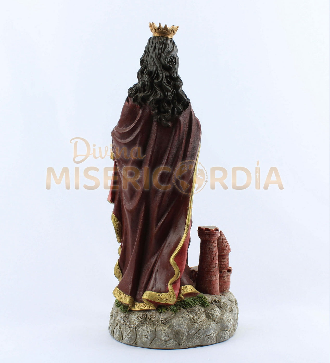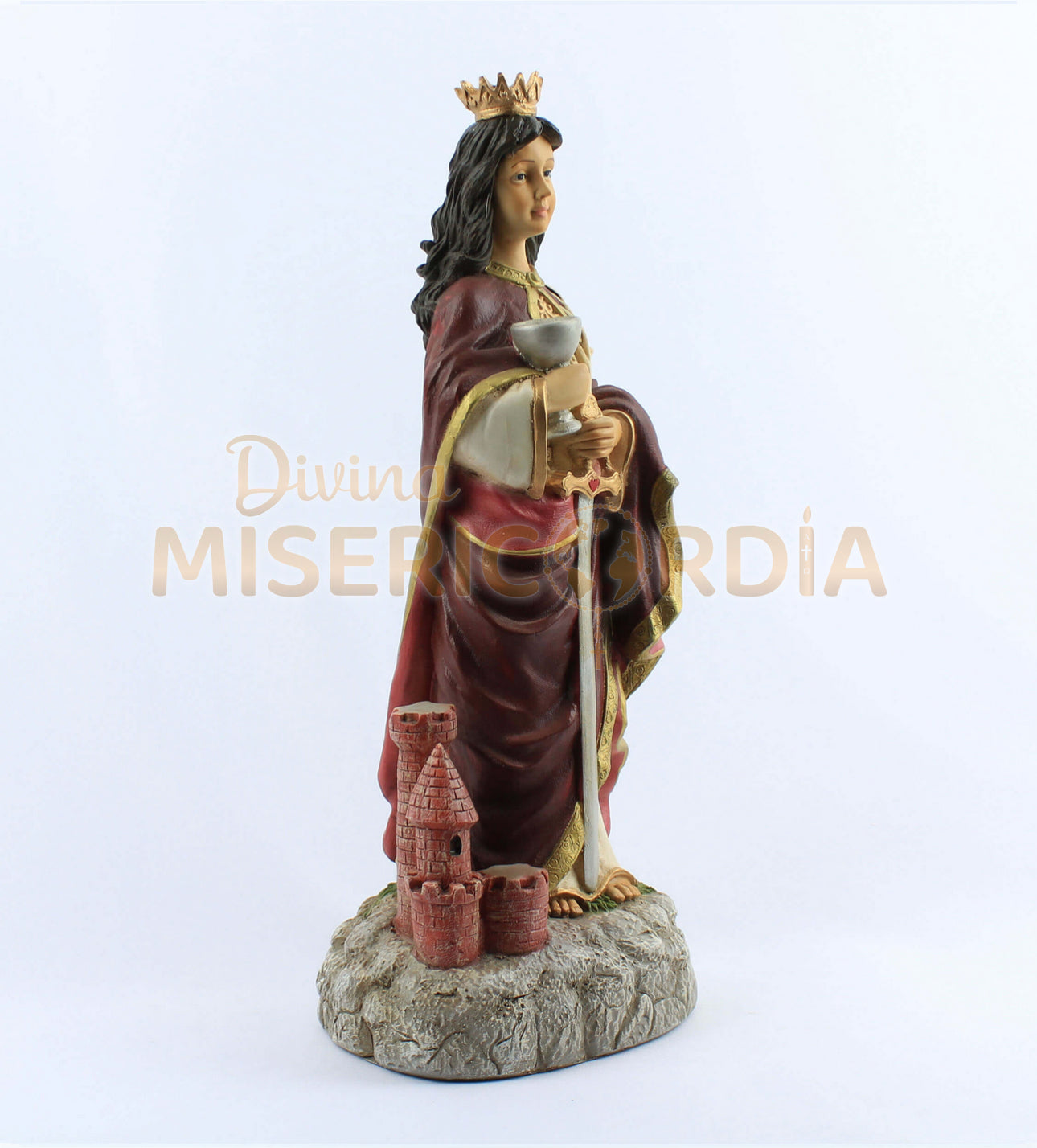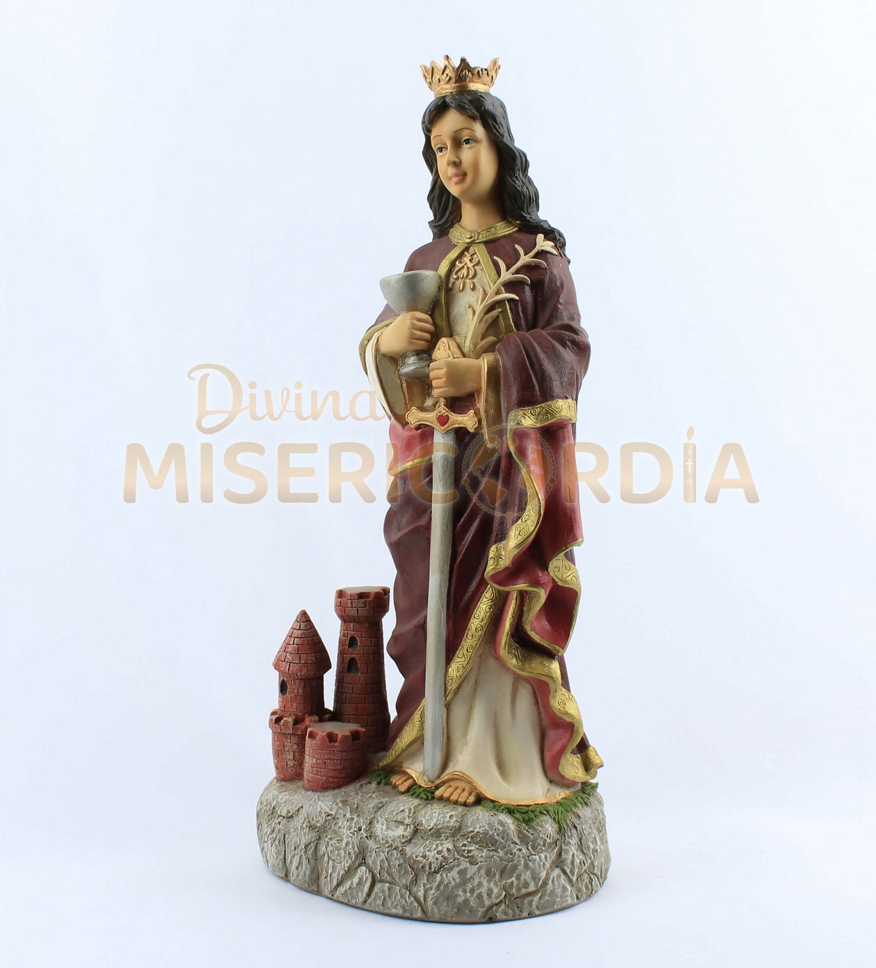 Cada elemento de su imagen, desde su majestuosa vestimenta hasta la espada y la torre que la representan, ha sido cuidadosamente trabajado para reflejar su esencia y protección. Es una pieza ideal para la oración, la decoración de tu hogar o un regalo significativo para quienes buscan su amparo.