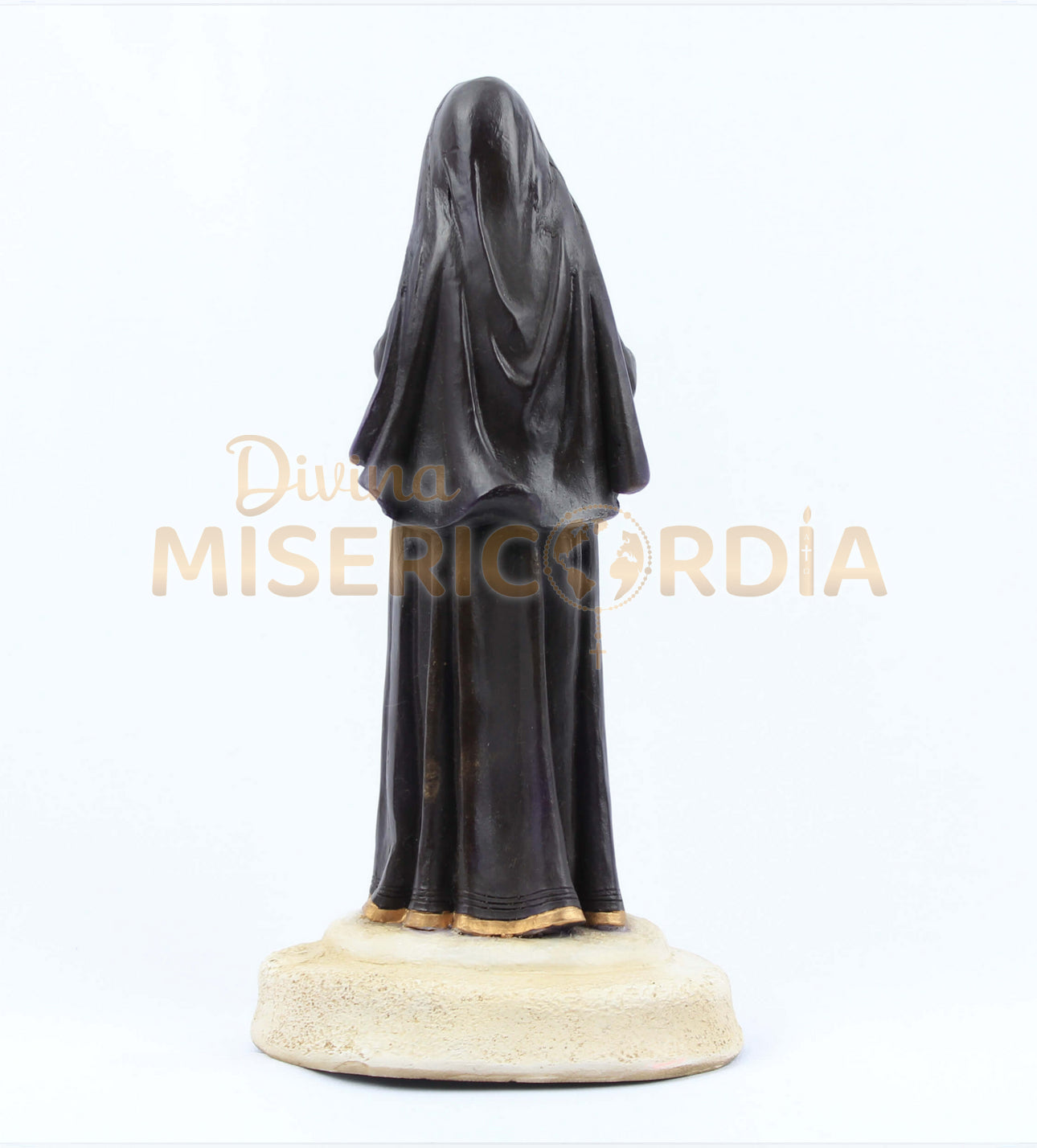 Su imagen, representada con la cruz, refleja su entrega y amor a Dios, convirtiéndola en una pieza ideal para la oración, la decoración del hogar o un regalo espiritual lleno de significado. Su acabado duradero y realista asegura que mantendrá su belleza con el paso del tiempo.