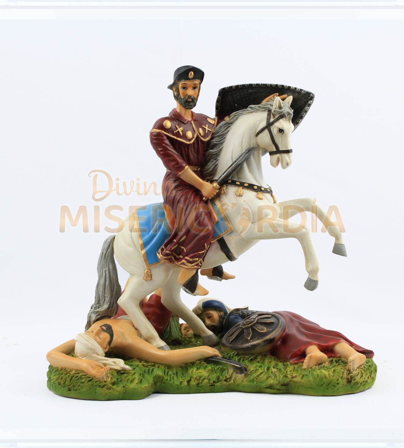 Esta majestuosa imagen de Santiago Apóstol muestra al santo con su tradicional vestimenta y su espada, símbolo de su valentía y compromiso con la fe. Elaborada en resina sólida de alta calidad, esta pieza refleja la fuerza y el coraje de uno de los más grandes apóstoles, quien luchó incansablemente por el Reino de Dios.