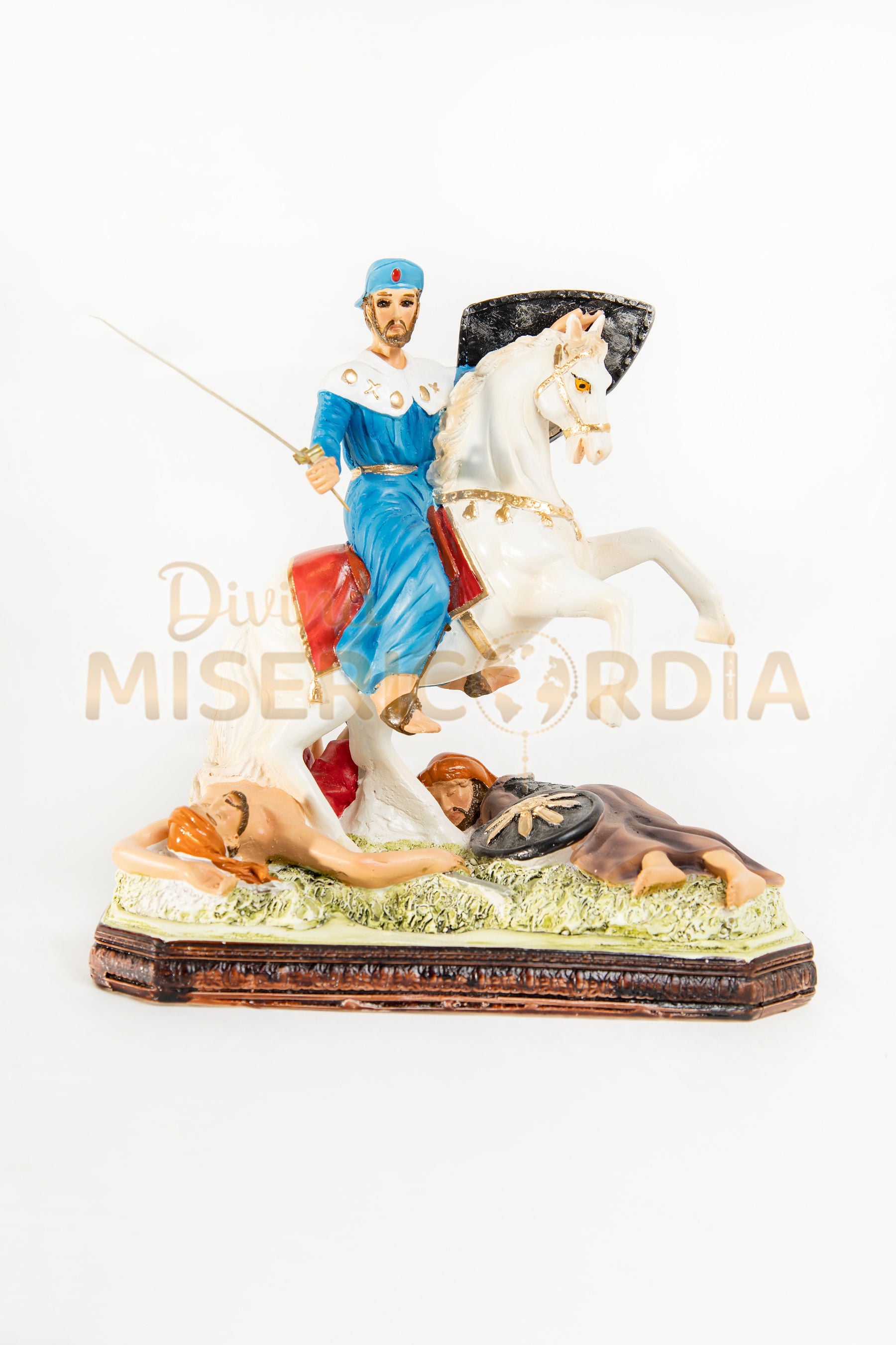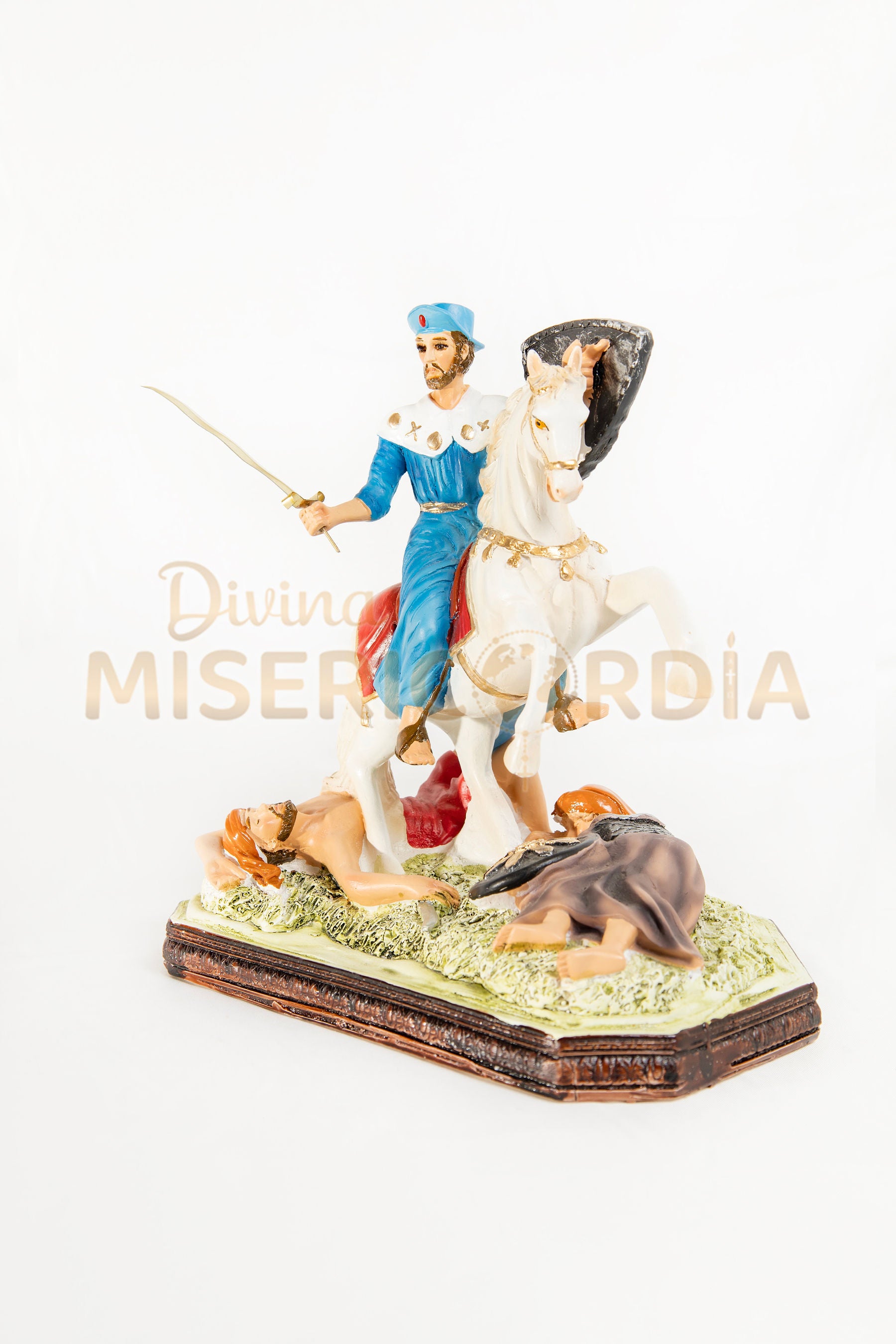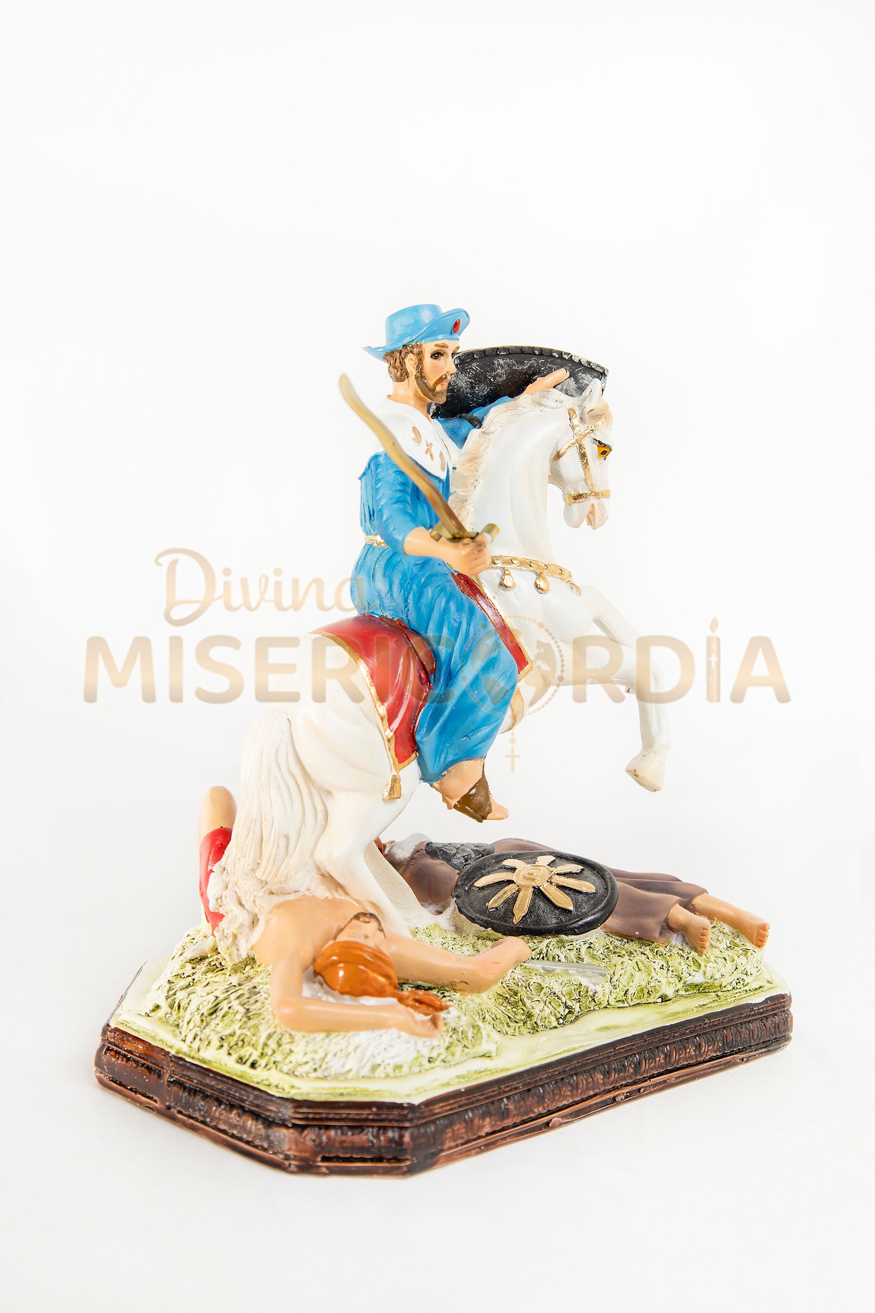 Rinde homenaje a Santiago Apóstol, santo patrón de España y símbolo de valentía y lucha por la fe, representado aquí en su emblemática imagen montando su caballo junto al moro vencido. Esta hermosa escultura, elaborada en resina de alta calidad, captura la fuerza y determinación que caracterizan su misión evangelizadora.