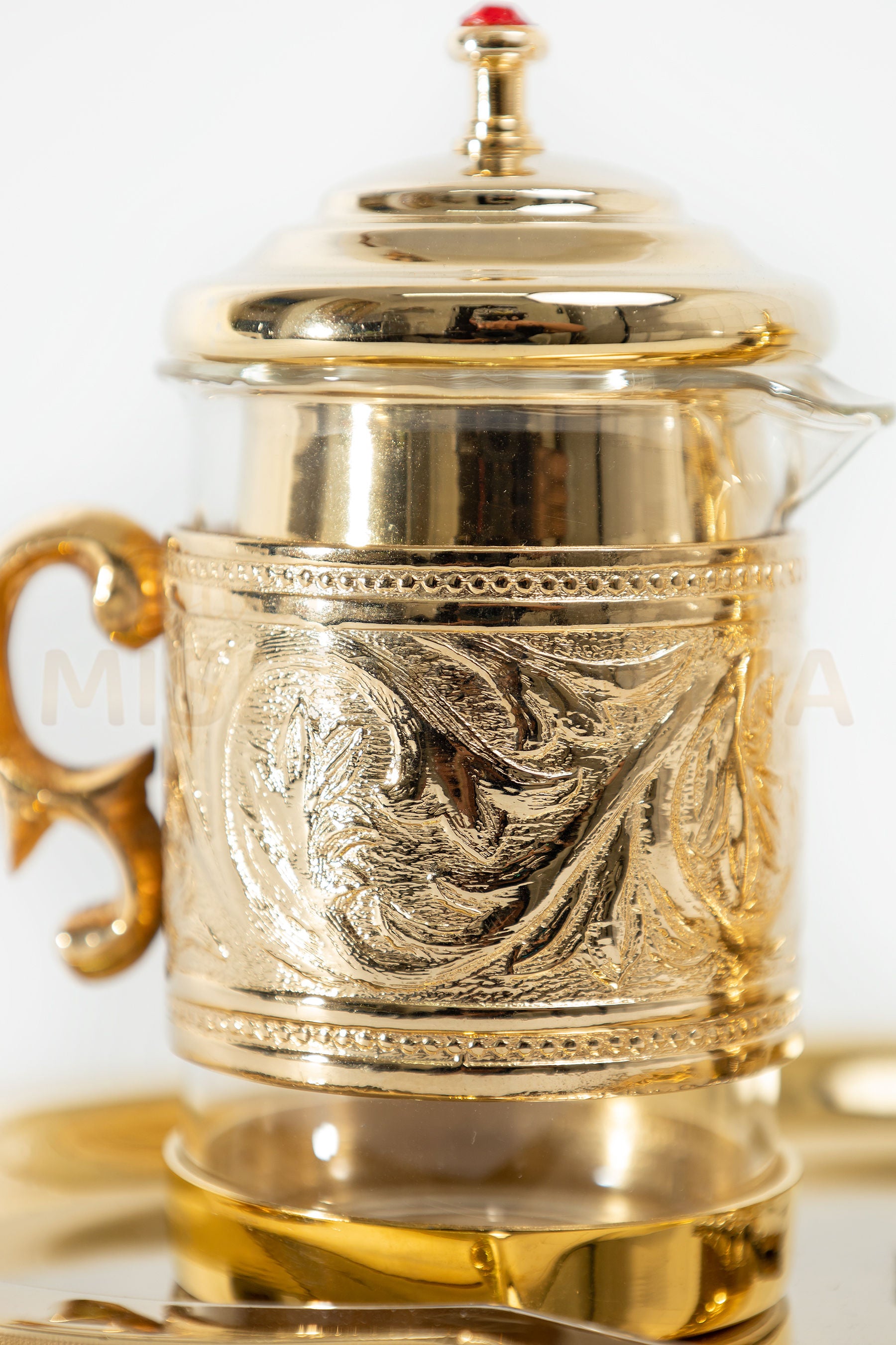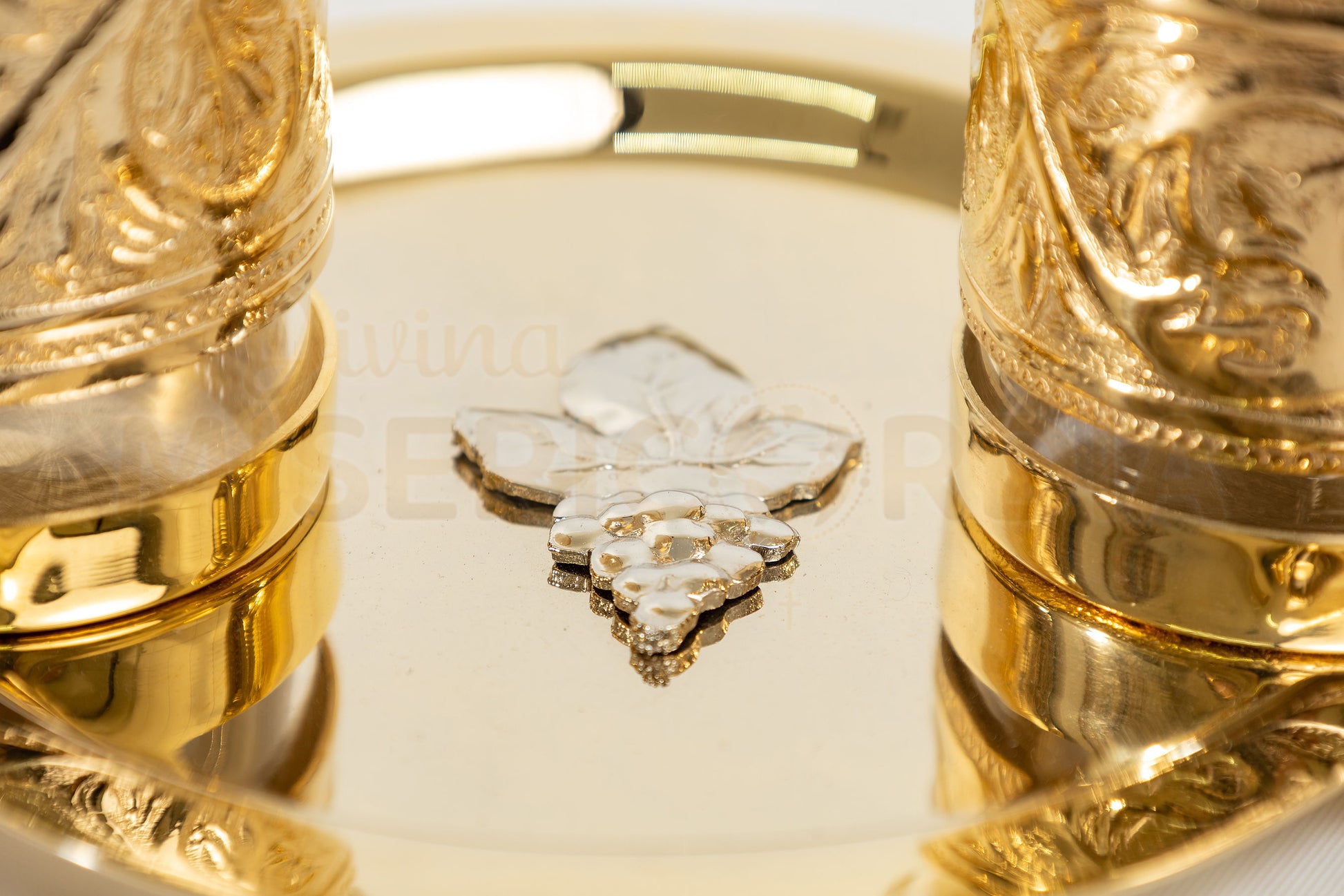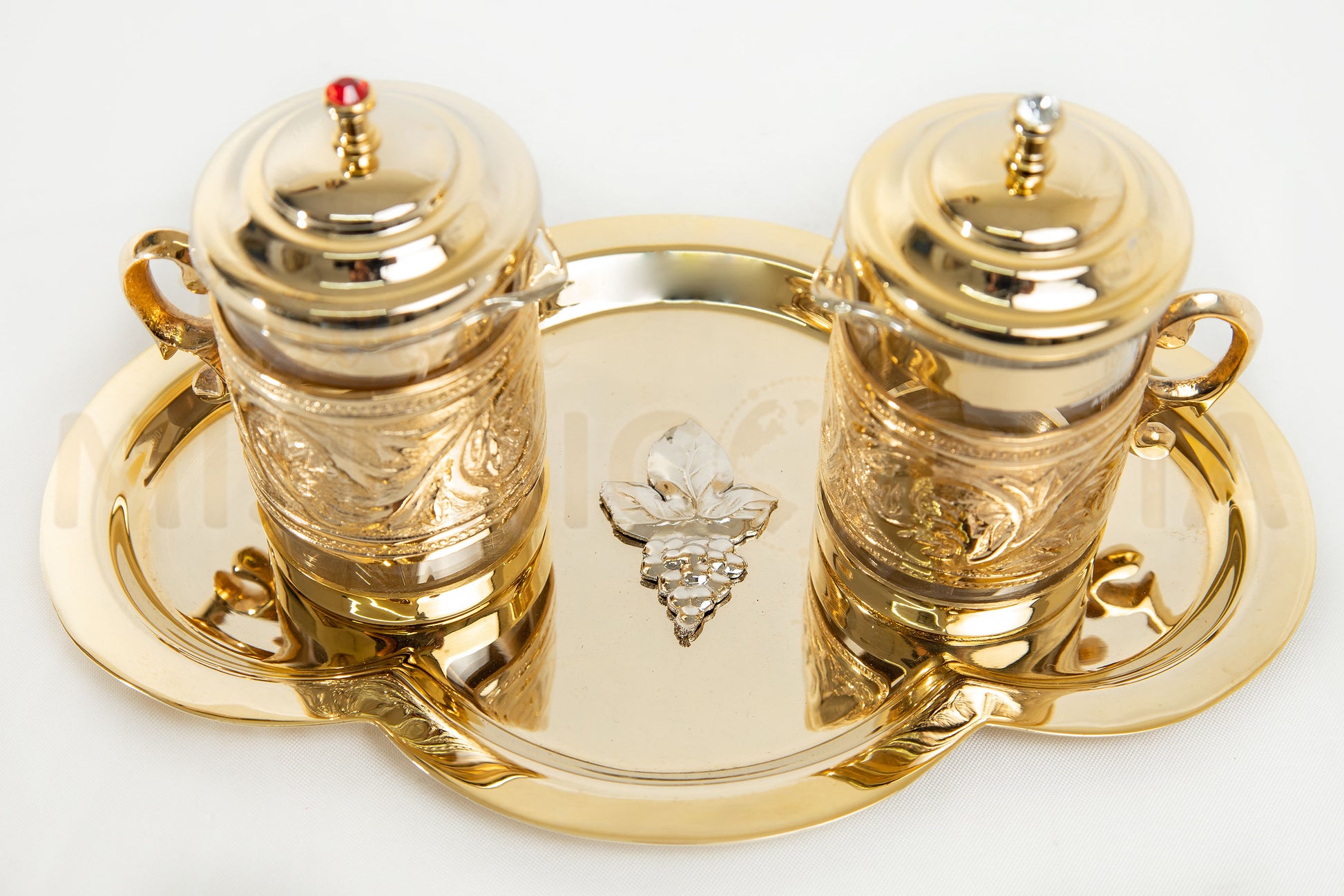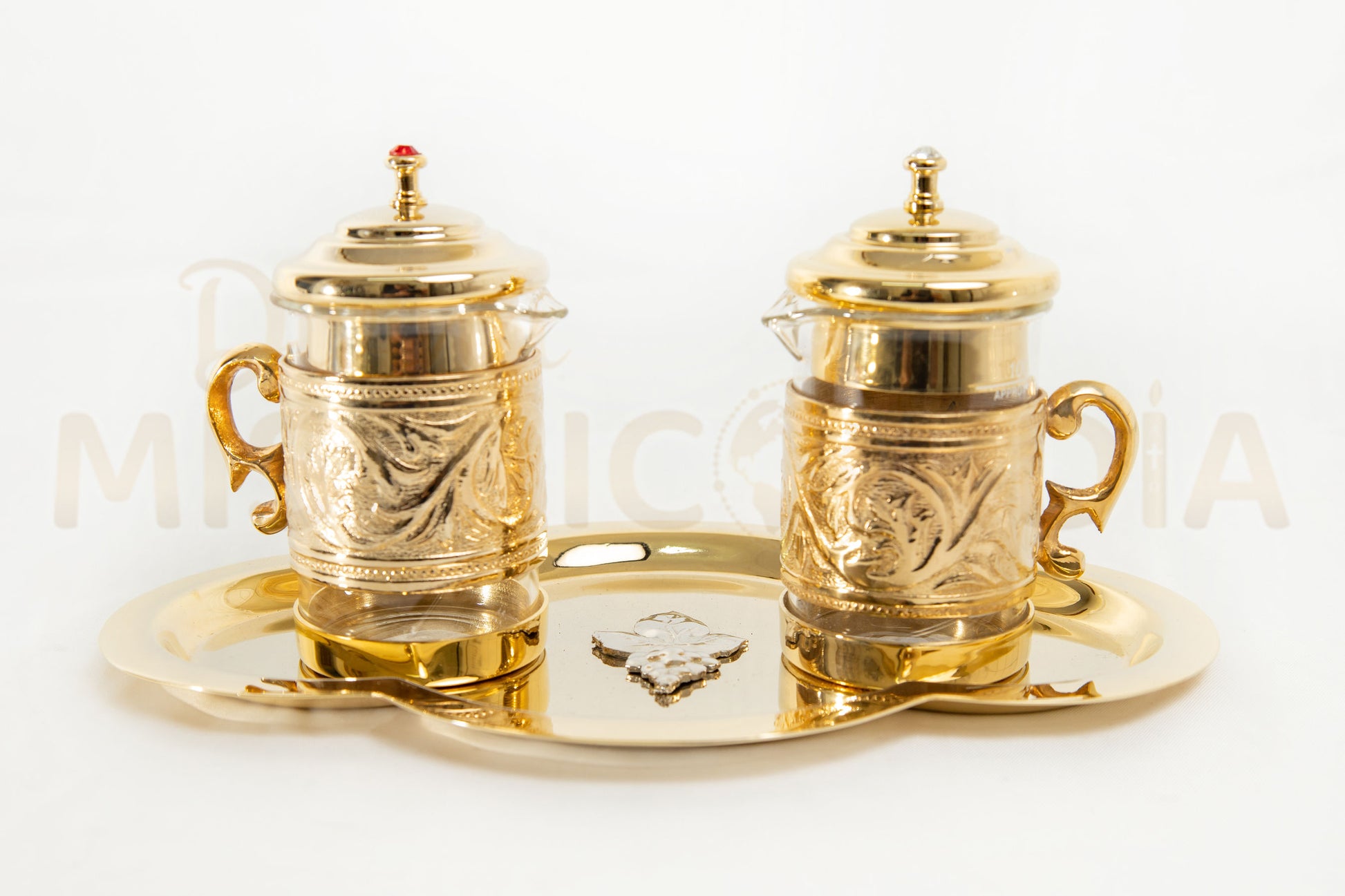 Realza la solemnidad de la liturgia con estas vinajeras elaboradas en latón de alta calidad y con un acabado en baño de oro de 24K, que aporta brillo, elegancia y durabilidad excepcionales. Perfectas para contener el agua y el vino durante la celebración eucarística, combinan funcionalidad con un diseño refinado que enaltece cualquier altar.