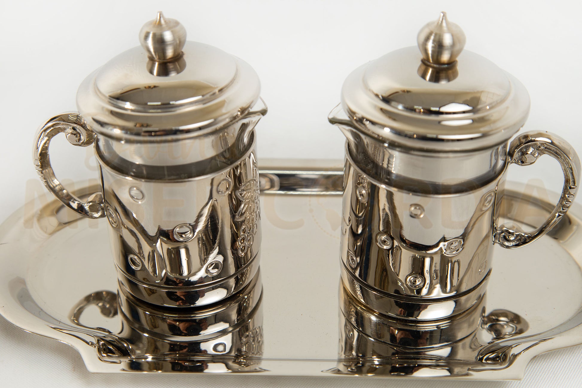 Eleva la solemnidad de la liturgia con estas finas vinajeras elaboradas en cristal de alta calidad, complementadas con acabados en níquel que aportan brillo, resistencia y un toque de distinción. Diseñadas para contener el agua y el vino durante la celebración eucarística, combinan funcionalidad y belleza artesanal.