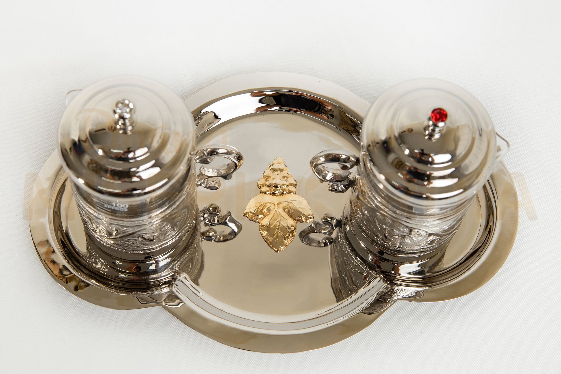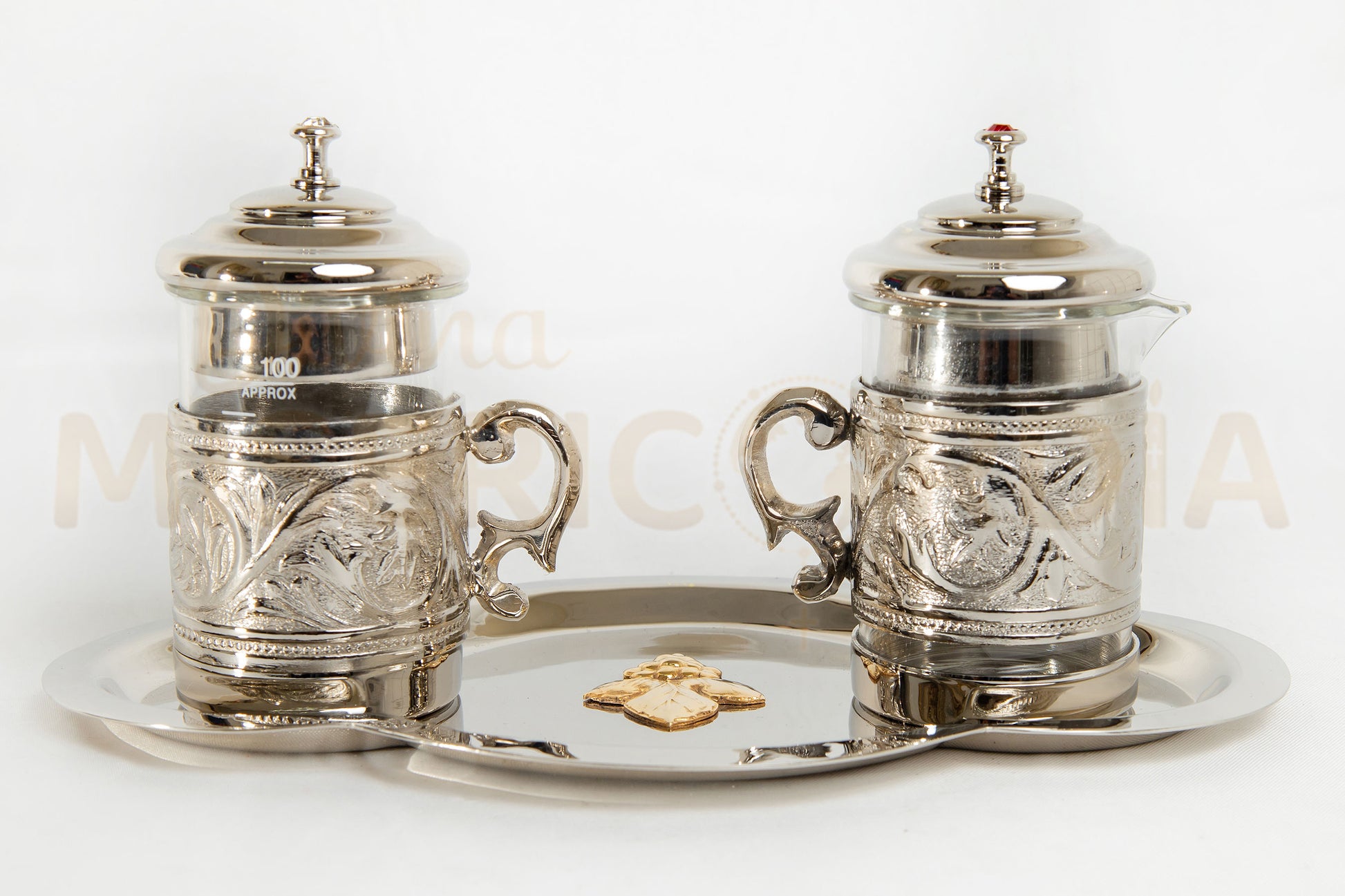 Eleva la solemnidad de la liturgia con estas finas vinajeras elaboradas en cristal de alta calidad, complementadas con acabados en níquel que aportan brillo, resistencia y un toque de distinción. Diseñadas para contener el agua y el vino durante la celebración eucarística, combinan funcionalidad y belleza artesanal.