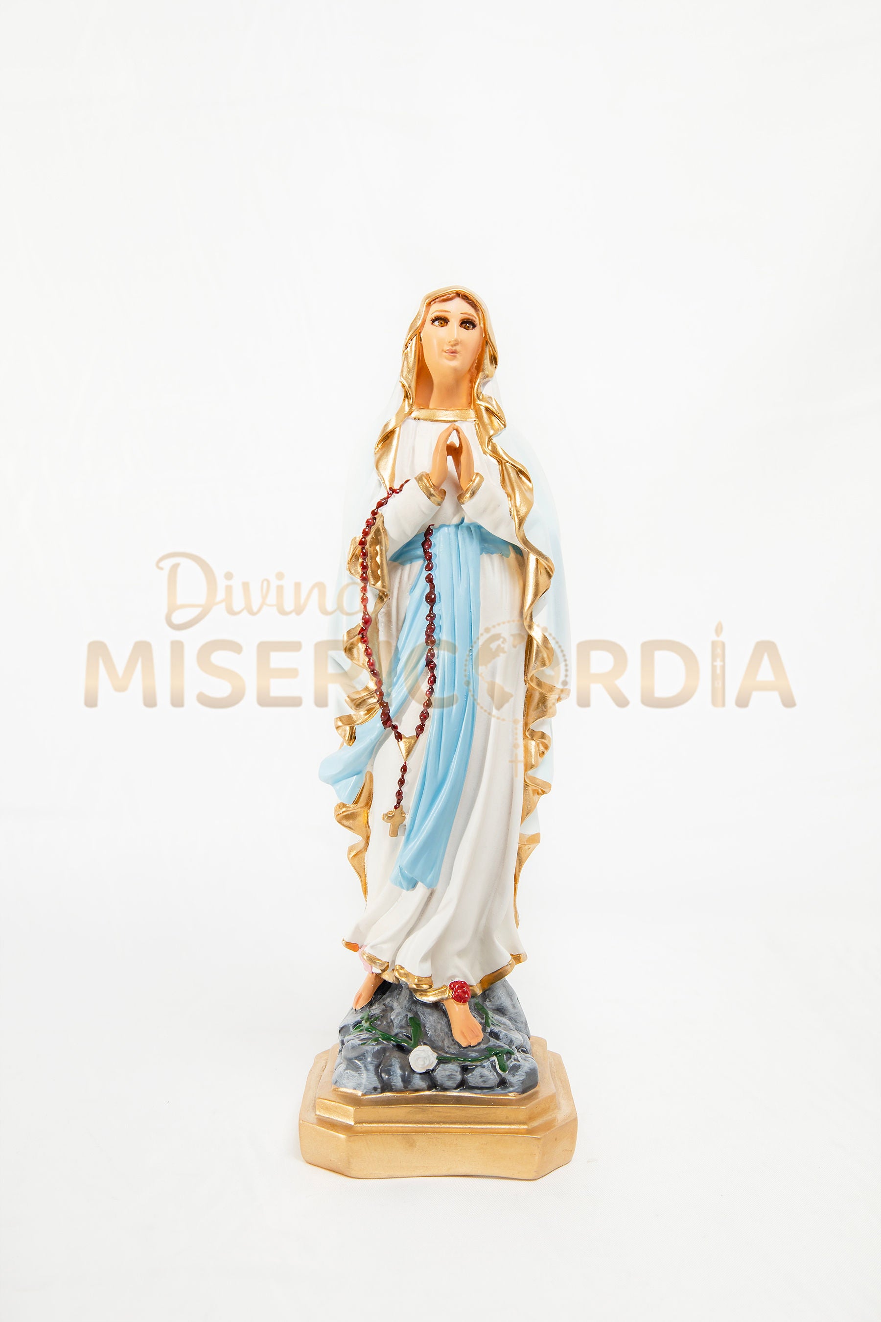 La Virgen de Lourdes es una advocación mariana reconocida mundialmente por sus apariciones a Santa Bernadette en Lourdes, Francia. Su imagen simboliza la pureza, la misericordia y la promesa de sanación espiritual y física.
